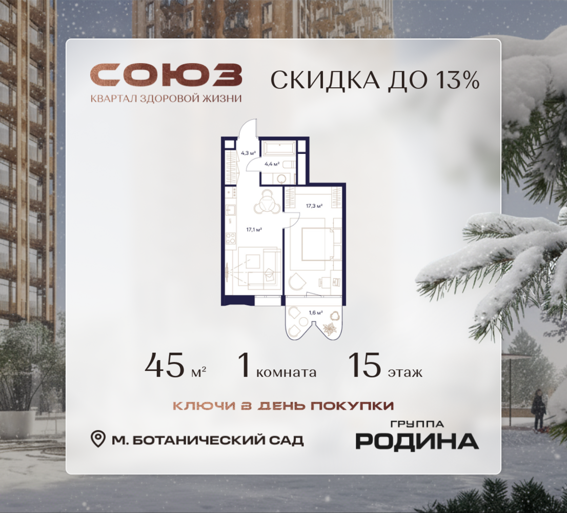 Готовые дома и ключи в день покупки <p> </p> Рассрочка 0% <p> </p> Продаётся 1-комнатная квартира площадью 45 м² на 15 этаже в Жилом Комплексе «Союз». <p> </p> Квартал здоровой жизни премиум-класса с рекордным количеством олимпийских видов спорта: <p> </p> - Ледовая арена для хоккея и фигурного катания, - Футбольные поля для тренировок, - Спортивный зал для фехтования, - Бассейн на 6 дорожек, - Центр единоборств, - 4 крытых площадки для настольного тенниса, - 7 теннисных кортов (крытых и открытых), - 4 крытых площадки для сквоша, - Легкоатлетический стадион, - Площадки для баскетбола и волейбола. <p> </p> <p> </p> Уникальные форматы квартир с мастер-спальнями, приватными террасами, балконами, а также пентхаусы с открыточными видами на город. <p> </p> Все квартиры продаются с отделкой Shell&Core и панорамным остеклением. <p> </p> <p> </p> Расположение <p> </p> Пешком: <p> </p> - 2 мин. до парка «Сад Будущего»; - 6 мин. до ст. м. «Ботанический сад»; - 6 мин. до ст. МЦК «Ботанический сад»; - 6 мин. до парка «Леоновская роща»; <p> </p> <p> </p> На автомобиле: <p> </p> - 2 мин. до СВХ (МСД); - 5 мин. до Проспекта Мира; - 10 мин. до ТТК; - 15 мин. до Садового кольца; - 25 мин. до аэропорта «Шереметьево». <p> </p> <p> </p> Благоустройство <p> </p> - собственная спортивная инфраструктура 7 Га; - зона для пикников; - игровые и спортивные площадки для детей всех возрастов; - розарий, а также сосновые, каштановые и дубовые аллеи; - площадки под открытым небом для занятий спортом и йоги; - игровые комнаты для детей; - лаунж-зона для резидентов; - просторная переговорная для деловых встреч; - премиальный ресторан «Шабада» Сосо Павлиашвили с водными арт-объектами на прогулочной аллее, садом ароматных трав и сценой под открытым небом; - кафе, химчистки, аптеки и супермаркеты рядом с домом. <p> </p> <p> </p> Окружение <p> </p> - 8 парков: Сад Будущего, Леоновская роща, Хуамин, Главный ботанический сад РАН, Шереметьевская дубрава, Останкино, парк спорта «Яуза», пойма реки Яуза и музей-усадьба «Останкино»; - 3 ВУЗа: ВГИК, РГСУ, МГПУ; - 12 школ, в том числе: школа 1499 им. И.А. Докукина (топ 100), Brookes Moscow, IThub школа; - 18 детских садов, в том числе билингвальный ALERTUM KIDS; - один из крупнейших океанариумов Европы «Москвариум»; - один из крупнейших в Европе торгово-развлекательных центров «Европолис».