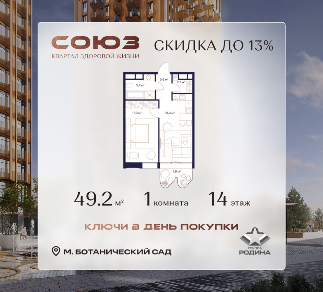 Готовые дома и ключи в день покупки <p> </p> Рассрочка 0% <p> </p> Продаётся 1-комнатная квартира площадью 49.2 м² на 14 этаже в Жилом Комплексе «Союз». <p> </p> Квартал здоровой жизни премиум-класса с рекордным количеством олимпийских видов спорта: <p> </p> - Ледовая арена для хоккея и фигурного катания, - Футбольные поля для тренировок, - Спортивный зал для фехтования, - Бассейн на 6 дорожек, - Центр единоборств, - 4 крытых площадки для настольного тенниса, - 7 теннисных кортов (крытых и открытых), - 4 крытых площадки для сквоша, - Легкоатлетический стадион, - Площадки для баскетбола и волейбола. <p> </p> <p> </p> Уникальные форматы квартир с мастер-спальнями, приватными террасами, балконами, а также пентхаусы с открыточными видами на город. <p> </p> Все квартиры продаются с отделкой Shell&Core и панорамным остеклением. <p> </p> <p> </p> Расположение <p> </p> Пешком: <p> </p> - 2 мин. до парка «Сад Будущего»; - 6 мин. до ст. м. «Ботанический сад»; - 6 мин. до ст. МЦК «Ботанический сад»; - 6 мин. до парка «Леоновская роща»; <p> </p> <p> </p> На автомобиле: <p> </p> - 2 мин. до СВХ (МСД); - 5 мин. до Проспекта Мира; - 10 мин. до ТТК; - 15 мин. до Садового кольца; - 25 мин. до аэропорта «Шереметьево». <p> </p> <p> </p> Благоустройство <p> </p> - собственная спортивная инфраструктура 7 Га; - зона для пикников; - игровые и спортивные площадки для детей всех возрастов; - розарий, а также сосновые, каштановые и дубовые аллеи; - площадки под открытым небом для занятий спортом и йоги; - игровые комнаты для детей; - лаунж-зона для резидентов; - просторная переговорная для деловых встреч; - премиальный ресторан «Шабада» Сосо Павлиашвили с водными арт-объектами на прогулочной аллее, садом ароматных трав и сценой под открытым небом; - кафе, химчистки, аптеки и супермаркеты рядом с домом. <p> </p> <p> </p> Окружение <p> </p> - 8 парков: Сад Будущего, Леоновская роща, Хуамин, Главный ботанический сад РАН, Шереметьевская дубрава, Останкино, парк спорта «Яуза», пойма реки Яуза и музей-усадьба «Останкино»; - 3 ВУЗа: ВГИК, РГСУ, МГПУ; - 12 школ, в том числе: школа 1499 им. И.А. Докукина (топ 100), Brookes Moscow, IThub школа; - 18 детских садов, в том числе билингвальный ALERTUM KIDS; - один из крупнейших океанариумов Европы «Москвариум»; - один из крупнейших в Европе торгово-развлекательных центров «Европолис».