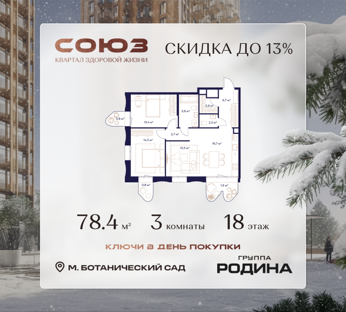 Готовые дома и ключи в день покупки <p> </p> Рассрочка 0% <p> </p> Продаётся 3-комнатная квартира площадью 78.4 м² на 18 этаже в Жилом Комплексе «Союз». <p> </p> Квартал здоровой жизни премиум-класса с рекордным количеством олимпийских видов спорта: <p> </p> - Ледовая арена для хоккея и фигурного катания, - Футбольные поля для тренировок, - Спортивный зал для фехтования, - Бассейн на 6 дорожек, - Центр единоборств, - 4 крытых площадки для настольного тенниса, - 7 теннисных кортов (крытых и открытых), - 4 крытых площадки для сквоша, - Легкоатлетический стадион, - Площадки для баскетбола и волейбола. <p> </p> <p> </p> Уникальные форматы квартир с мастер-спальнями, приватными террасами, балконами, а также пентхаусы с открыточными видами на город. <p> </p> Все квартиры продаются с отделкой Shell&Core и панорамным остеклением. <p> </p> <p> </p> Расположение <p> </p> Пешком: <p> </p> - 2 мин. до парка «Сад Будущего»; - 6 мин. до ст. м. «Ботанический сад»; - 6 мин. до ст. МЦК «Ботанический сад»; - 6 мин. до парка «Леоновская роща»; <p> </p> <p> </p> На автомобиле: <p> </p> - 2 мин. до СВХ (МСД); - 5 мин. до Проспекта Мира; - 10 мин. до ТТК; - 15 мин. до Садового кольца; - 25 мин. до аэропорта «Шереметьево». <p> </p> <p> </p> Благоустройство <p> </p> - собственная спортивная инфраструктура 7 Га; - зона для пикников; - игровые и спортивные площадки для детей всех возрастов; - розарий, а также сосновые, каштановые и дубовые аллеи; - площадки под открытым небом для занятий спортом и йоги; - игровые комнаты для детей; - лаунж-зона для резидентов; - просторная переговорная для деловых встреч; - премиальный ресторан «Шабада» Сосо Павлиашвили с водными арт-объектами на прогулочной аллее, садом ароматных трав и сценой под открытым небом; - кафе, химчистки, аптеки и супермаркеты рядом с домом. <p> </p> <p> </p> Окружение <p> </p> - 8 парков: Сад Будущего, Леоновская роща, Хуамин, Главный ботанический сад РАН, Шереметьевская дубрава, Останкино, парк спорта «Яуза», пойма реки Яуза и музей-усадьба «Останкино»; - 3 ВУЗа: ВГИК, РГСУ, МГПУ; - 12 школ, в том числе: школа 1499 им. И.А. Докукина (топ 100), Brookes Moscow, IThub школа; - 18 детских садов, в том числе билингвальный ALERTUM KIDS; - один из крупнейших океанариумов Европы «Москвариум»; - один из крупнейших в Европе торгово-развлекательных центров «Европолис».