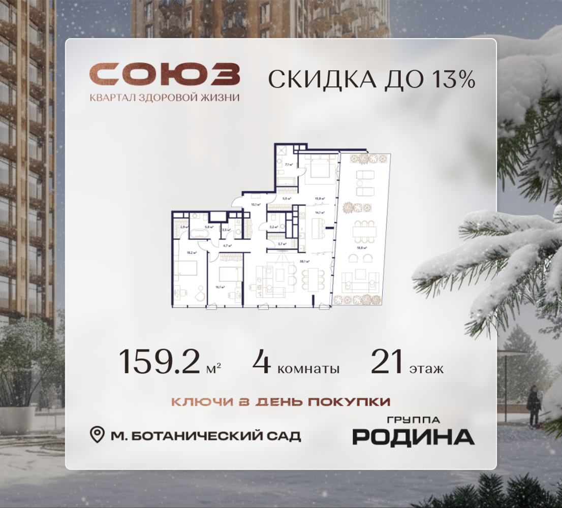 Готовые дома и ключи в день покупки <p> </p> Рассрочка 0% <p> </p> Продаётся 4-комнатная квартира площадью 159.2 м² на 21 этаже в Жилом Комплексе «Союз». <p> </p> Квартал здоровой жизни премиум-класса с рекордным количеством олимпийских видов спорта: <p> </p> - Ледовая арена для хоккея и фигурного катания, - Футбольные поля для тренировок, - Спортивный зал для фехтования, - Бассейн на 6 дорожек, - Центр единоборств, - 4 крытых площадки для настольного тенниса, - 7 теннисных кортов (крытых и открытых), - 4 крытых площадки для сквоша, - Легкоатлетический стадион, - Площадки для баскетбола и волейбола. <p> </p> <p> </p> Уникальные форматы квартир с мастер-спальнями, приватными террасами, балконами, а также пентхаусы с открыточными видами на город. <p> </p> Все квартиры продаются с отделкой Shell&Core и панорамным остеклением. <p> </p> <p> </p> Расположение <p> </p> Пешком: <p> </p> - 2 мин. до парка «Сад Будущего»; - 6 мин. до ст. м. «Ботанический сад»; - 6 мин. до ст. МЦК «Ботанический сад»; - 6 мин. до парка «Леоновская роща»; <p> </p> <p> </p> На автомобиле: <p> </p> - 2 мин. до СВХ (МСД); - 5 мин. до Проспекта Мира; - 10 мин. до ТТК; - 15 мин. до Садового кольца; - 25 мин. до аэропорта «Шереметьево». <p> </p> <p> </p> Благоустройство <p> </p> - собственная спортивная инфраструктура 7 Га; - зона для пикников; - игровые и спортивные площадки для детей всех возрастов; - розарий, а также сосновые, каштановые и дубовые аллеи; - площадки под открытым небом для занятий спортом и йоги; - игровые комнаты для детей; - лаунж-зона для резидентов; - просторная переговорная для деловых встреч; - премиальный ресторан «Шабада» Сосо Павлиашвили с водными арт-объектами на прогулочной аллее, садом ароматных трав и сценой под открытым небом; - кафе, химчистки, аптеки и супермаркеты рядом с домом. <p> </p> <p> </p> Окружение <p> </p> - 8 парков: Сад Будущего, Леоновская роща, Хуамин, Главный ботанический сад РАН, Шереметьевская дубрава, Останкино, парк спорта «Яуза», пойма реки Яуза и музей-усадьба «Останкино»; - 3 ВУЗа: ВГИК, РГСУ, МГПУ; - 12 школ, в том числе: школа 1499 им. И.А. Докукина (топ 100), Brookes Moscow, IThub школа; - 18 детских садов, в том числе билингвальный ALERTUM KIDS; - один из крупнейших океанариумов Европы «Москвариум»; - один из крупнейших в Европе торгово-развлекательных центров «Европолис».