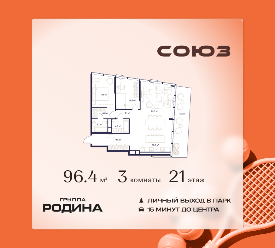 Готовые дома и ключи в день покупки <p> </p> Рассрочка 0% <p> </p> Продаётся 3-комнатная квартира площадью 96.4 м² на 21 этаже в Жилом Комплексе «Союз». <p> </p> Квартал здоровой жизни премиум-класса с рекордным количеством олимпийских видов спорта: <p> </p> - Ледовая арена для хоккея и фигурного катания, - Футбольные поля для тренировок, - Спортивный зал для фехтования, - Бассейн на 6 дорожек, - Центр единоборств, - 4 крытых площадки для настольного тенниса, - 7 теннисных кортов (крытых и открытых), - 4 крытых площадки для сквоша, - Легкоатлетический стадион, - Площадки для баскетбола и волейбола. <p> </p> <p> </p> Уникальные форматы квартир с мастер-спальнями, приватными террасами, балконами, а также пентхаусы с открыточными видами на город. <p> </p> Все квартиры продаются с отделкой Shell&Core и панорамным остеклением. <p> </p> <p> </p> Расположение <p> </p> Пешком: <p> </p> - 2 мин. до парка «Сад Будущего»; - 6 мин. до ст. м. «Ботанический сад»; - 6 мин. до ст. МЦК «Ботанический сад»; - 6 мин. до парка «Леоновская роща»; <p> </p> <p> </p> На автомобиле: <p> </p> - 2 мин. до СВХ (МСД); - 5 мин. до Проспекта Мира; - 10 мин. до ТТК; - 15 мин. до Садового кольца; - 25 мин. до аэропорта «Шереметьево». <p> </p> <p> </p> Благоустройство <p> </p> - собственная спортивная инфраструктура 7 Га; - зона для пикников; - игровые и спортивные площадки для детей всех возрастов; - розарий, а также сосновые, каштановые и дубовые аллеи; - площадки под открытым небом для занятий спортом и йоги; - игровые комнаты для детей; - лаунж-зона для резидентов; - просторная переговорная для деловых встреч; - премиальный ресторан «Шабада» Сосо Павлиашвили с водными арт-объектами на прогулочной аллее, садом ароматных трав и сценой под открытым небом; - кафе, химчистки, аптеки и супермаркеты рядом с домом. <p> </p> <p> </p> Окружение <p> </p> - 8 парков: Сад Будущего, Леоновская роща, Хуамин, Главный ботанический сад РАН, Шереметьевская дубрава, Останкино, парк спорта «Яуза», пойма реки Яуза и музей-усадьба «Останкино»; - 3 ВУЗа: ВГИК, РГСУ, МГПУ; - 12 школ, в том числе: школа 1499 им. И.А. Докукина (топ 100), Brookes Moscow, IThub школа; - 18 детских садов, в том числе билингвальный ALERTUM KIDS; - один из крупнейших океанариумов Европы «Москвариум»; - один из крупнейших в Европе торгово-развлекательных центров «Европолис».