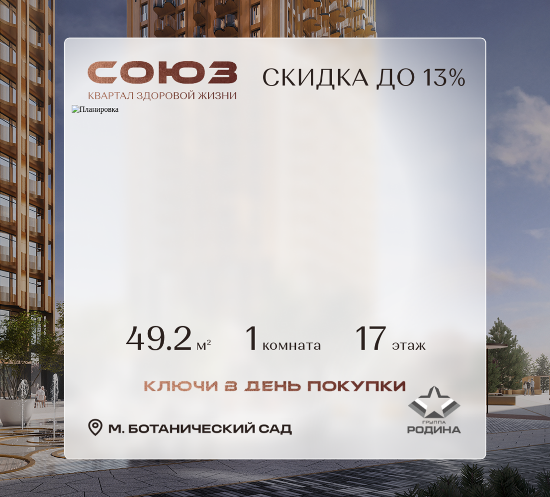 Готовые дома и ключи в день покупки <p> </p> Рассрочка 0% <p> </p> Продаётся 1-комнатная квартира площадью 49.2 м² на 17 этаже в Жилом Комплексе «Союз». <p> </p> Квартал здоровой жизни премиум-класса с рекордным количеством олимпийских видов спорта: <p> </p> - Ледовая арена для хоккея и фигурного катания, - Футбольные поля для тренировок, - Спортивный зал для фехтования, - Бассейн на 6 дорожек, - Центр единоборств, - 4 крытых площадки для настольного тенниса, - 7 теннисных кортов (крытых и открытых), - 4 крытых площадки для сквоша, - Легкоатлетический стадион, - Площадки для баскетбола и волейбола. <p> </p> <p> </p> Уникальные форматы квартир с мастер-спальнями, приватными террасами, балконами, а также пентхаусы с открыточными видами на город. <p> </p> Все квартиры продаются с отделкой Shell&Core и панорамным остеклением. <p> </p> <p> </p> Расположение <p> </p> Пешком: <p> </p> - 2 мин. до парка «Сад Будущего»; - 6 мин. до ст. м. «Ботанический сад»; - 6 мин. до ст. МЦК «Ботанический сад»; - 6 мин. до парка «Леоновская роща»; <p> </p> <p> </p> На автомобиле: <p> </p> - 2 мин. до СВХ (МСД); - 5 мин. до Проспекта Мира; - 10 мин. до ТТК; - 15 мин. до Садового кольца; - 25 мин. до аэропорта «Шереметьево». <p> </p> <p> </p> Благоустройство <p> </p> - собственная спортивная инфраструктура 7 Га; - зона для пикников; - игровые и спортивные площадки для детей всех возрастов; - розарий, а также сосновые, каштановые и дубовые аллеи; - площадки под открытым небом для занятий спортом и йоги; - игровые комнаты для детей; - лаунж-зона для резидентов; - просторная переговорная для деловых встреч; - премиальный ресторан «Шабада» Сосо Павлиашвили с водными арт-объектами на прогулочной аллее, садом ароматных трав и сценой под открытым небом; - кафе, химчистки, аптеки и супермаркеты рядом с домом. <p> </p> <p> </p> Окружение <p> </p> - 8 парков: Сад Будущего, Леоновская роща, Хуамин, Главный ботанический сад РАН, Шереметьевская дубрава, Останкино, парк спорта «Яуза», пойма реки Яуза и музей-усадьба «Останкино»; - 3 ВУЗа: ВГИК, РГСУ, МГПУ; - 12 школ, в том числе: школа 1499 им. И.А. Докукина (топ 100), Brookes Moscow, IThub школа; - 18 детских садов, в том числе билингвальный ALERTUM KIDS; - один из крупнейших океанариумов Европы «Москвариум»; - один из крупнейших в Европе торгово-развлекательных центров «Европолис».