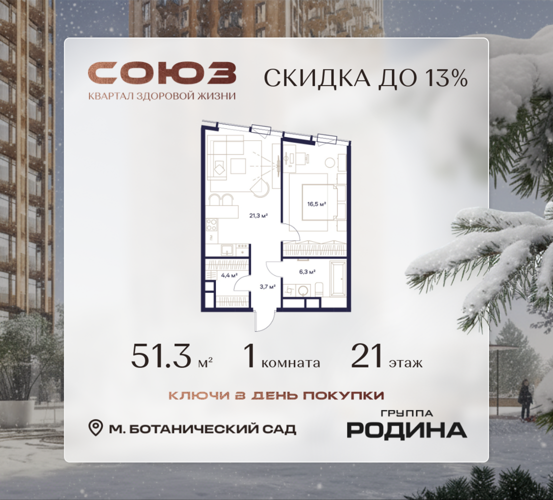 Готовые дома и ключи в день покупки <p> </p> Рассрочка 0% <p> </p> Продаётся 1-комнатная квартира площадью 51.3 м² на 21 этаже в Жилом Комплексе «Союз». <p> </p> Квартал здоровой жизни премиум-класса с рекордным количеством олимпийских видов спорта: <p> </p> - Ледовая арена для хоккея и фигурного катания, - Футбольные поля для тренировок, - Спортивный зал для фехтования, - Бассейн на 6 дорожек, - Центр единоборств, - 4 крытых площадки для настольного тенниса, - 7 теннисных кортов (крытых и открытых), - 4 крытых площадки для сквоша, - Легкоатлетический стадион, - Площадки для баскетбола и волейбола. <p> </p> <p> </p> Уникальные форматы квартир с мастер-спальнями, приватными террасами, балконами, а также пентхаусы с открыточными видами на город. <p> </p> Все квартиры продаются с отделкой Shell&Core и панорамным остеклением. <p> </p> <p> </p> Расположение <p> </p> Пешком: <p> </p> - 2 мин. до парка «Сад Будущего»; - 6 мин. до ст. м. «Ботанический сад»; - 6 мин. до ст. МЦК «Ботанический сад»; - 6 мин. до парка «Леоновская роща»; <p> </p> <p> </p> На автомобиле: <p> </p> - 2 мин. до СВХ (МСД); - 5 мин. до Проспекта Мира; - 10 мин. до ТТК; - 15 мин. до Садового кольца; - 25 мин. до аэропорта «Шереметьево». <p> </p> <p> </p> Благоустройство <p> </p> - собственная спортивная инфраструктура 7 Га; - зона для пикников; - игровые и спортивные площадки для детей всех возрастов; - розарий, а также сосновые, каштановые и дубовые аллеи; - площадки под открытым небом для занятий спортом и йоги; - игровые комнаты для детей; - лаунж-зона для резидентов; - просторная переговорная для деловых встреч; - премиальный ресторан «Шабада» Сосо Павлиашвили с водными арт-объектами на прогулочной аллее, садом ароматных трав и сценой под открытым небом; - кафе, химчистки, аптеки и супермаркеты рядом с домом. <p> </p> <p> </p> Окружение <p> </p> - 8 парков: Сад Будущего, Леоновская роща, Хуамин, Главный ботанический сад РАН, Шереметьевская дубрава, Останкино, парк спорта «Яуза», пойма реки Яуза и музей-усадьба «Останкино»; - 3 ВУЗа: ВГИК, РГСУ, МГПУ; - 12 школ, в том числе: школа 1499 им. И.А. Докукина (топ 100), Brookes Moscow, IThub школа; - 18 детских садов, в том числе билингвальный ALERTUM KIDS; - один из крупнейших океанариумов Европы «Москвариум»; - один из крупнейших в Европе торгово-развлекательных центров «Европолис».