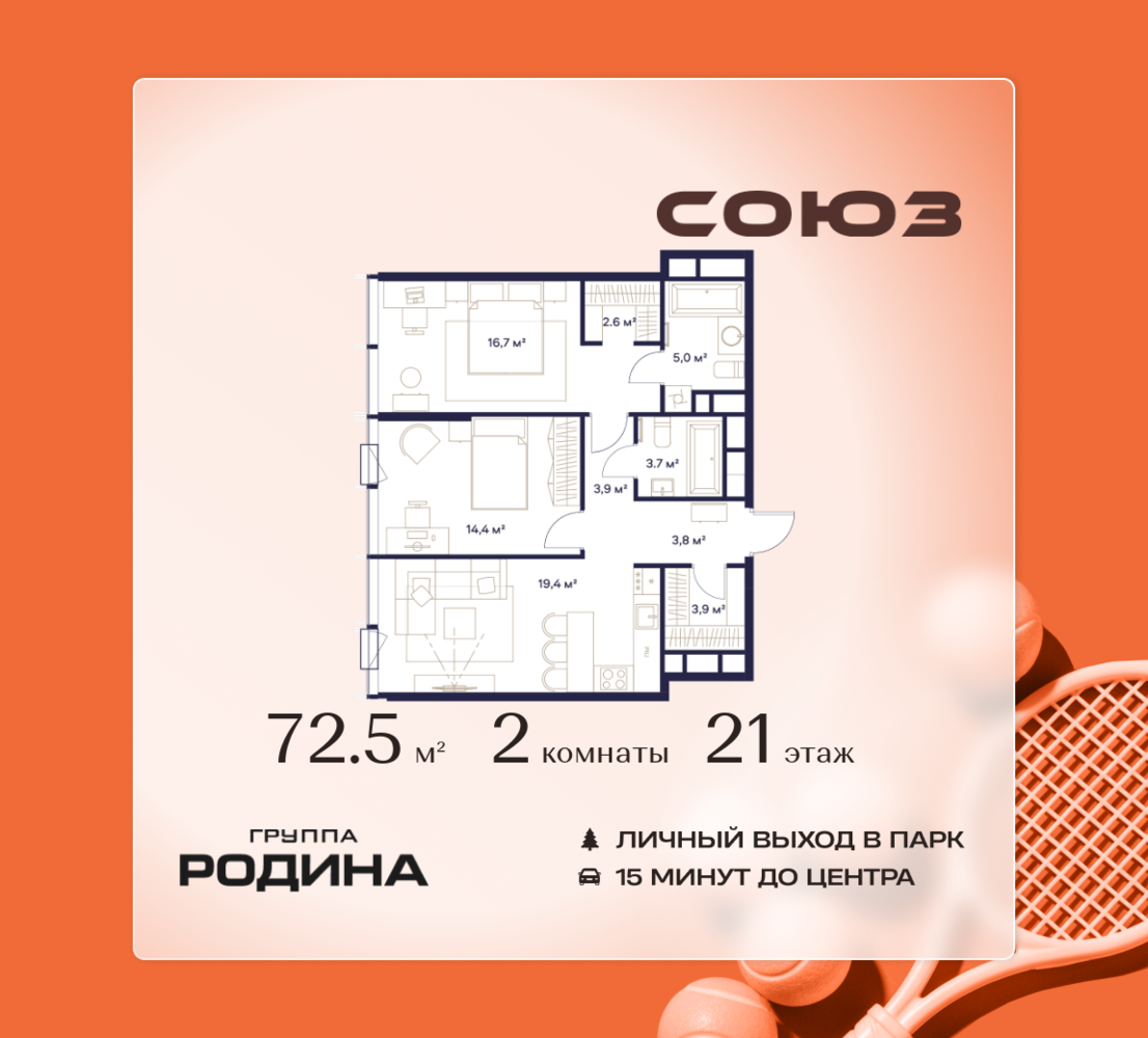 Готовые дома и ключи в день покупки <p> </p> Рассрочка 0% <p> </p> Продаётся 2-комнатная квартира площадью 72.5 м² на 21 этаже в Жилом Комплексе «Союз». <p> </p> Квартал здоровой жизни премиум-класса с рекордным количеством олимпийских видов спорта: <p> </p> - Ледовая арена для хоккея и фигурного катания, - Футбольные поля для тренировок, - Спортивный зал для фехтования, - Бассейн на 6 дорожек, - Центр единоборств, - 4 крытых площадки для настольного тенниса, - 7 теннисных кортов (крытых и открытых), - 4 крытых площадки для сквоша, - Легкоатлетический стадион, - Площадки для баскетбола и волейбола. <p> </p> <p> </p> Уникальные форматы квартир с мастер-спальнями, приватными террасами, балконами, а также пентхаусы с открыточными видами на город. <p> </p> Все квартиры продаются с отделкой Shell&Core и панорамным остеклением. <p> </p> <p> </p> Расположение <p> </p> Пешком: <p> </p> - 2 мин. до парка «Сад Будущего»; - 6 мин. до ст. м. «Ботанический сад»; - 6 мин. до ст. МЦК «Ботанический сад»; - 6 мин. до парка «Леоновская роща»; <p> </p> <p> </p> На автомобиле: <p> </p> - 2 мин. до СВХ (МСД); - 5 мин. до Проспекта Мира; - 10 мин. до ТТК; - 15 мин. до Садового кольца; - 25 мин. до аэропорта «Шереметьево». <p> </p> <p> </p> Благоустройство <p> </p> - собственная спортивная инфраструктура 7 Га; - зона для пикников; - игровые и спортивные площадки для детей всех возрастов; - розарий, а также сосновые, каштановые и дубовые аллеи; - площадки под открытым небом для занятий спортом и йоги; - игровые комнаты для детей; - лаунж-зона для резидентов; - просторная переговорная для деловых встреч; - премиальный ресторан «Шабада» Сосо Павлиашвили с водными арт-объектами на прогулочной аллее, садом ароматных трав и сценой под открытым небом; - кафе, химчистки, аптеки и супермаркеты рядом с домом. <p> </p> <p> </p> Окружение <p> </p> - 8 парков: Сад Будущего, Леоновская роща, Хуамин, Главный ботанический сад РАН, Шереметьевская дубрава, Останкино, парк спорта «Яуза», пойма реки Яуза и музей-усадьба «Останкино»; - 3 ВУЗа: ВГИК, РГСУ, МГПУ; - 12 школ, в том числе: школа 1499 им. И.А. Докукина (топ 100), Brookes Moscow, IThub школа; - 18 детских садов, в том числе билингвальный ALERTUM KIDS; - один из крупнейших океанариумов Европы «Москвариум»; - один из крупнейших в Европе торгово-развлекательных центров «Европолис».
