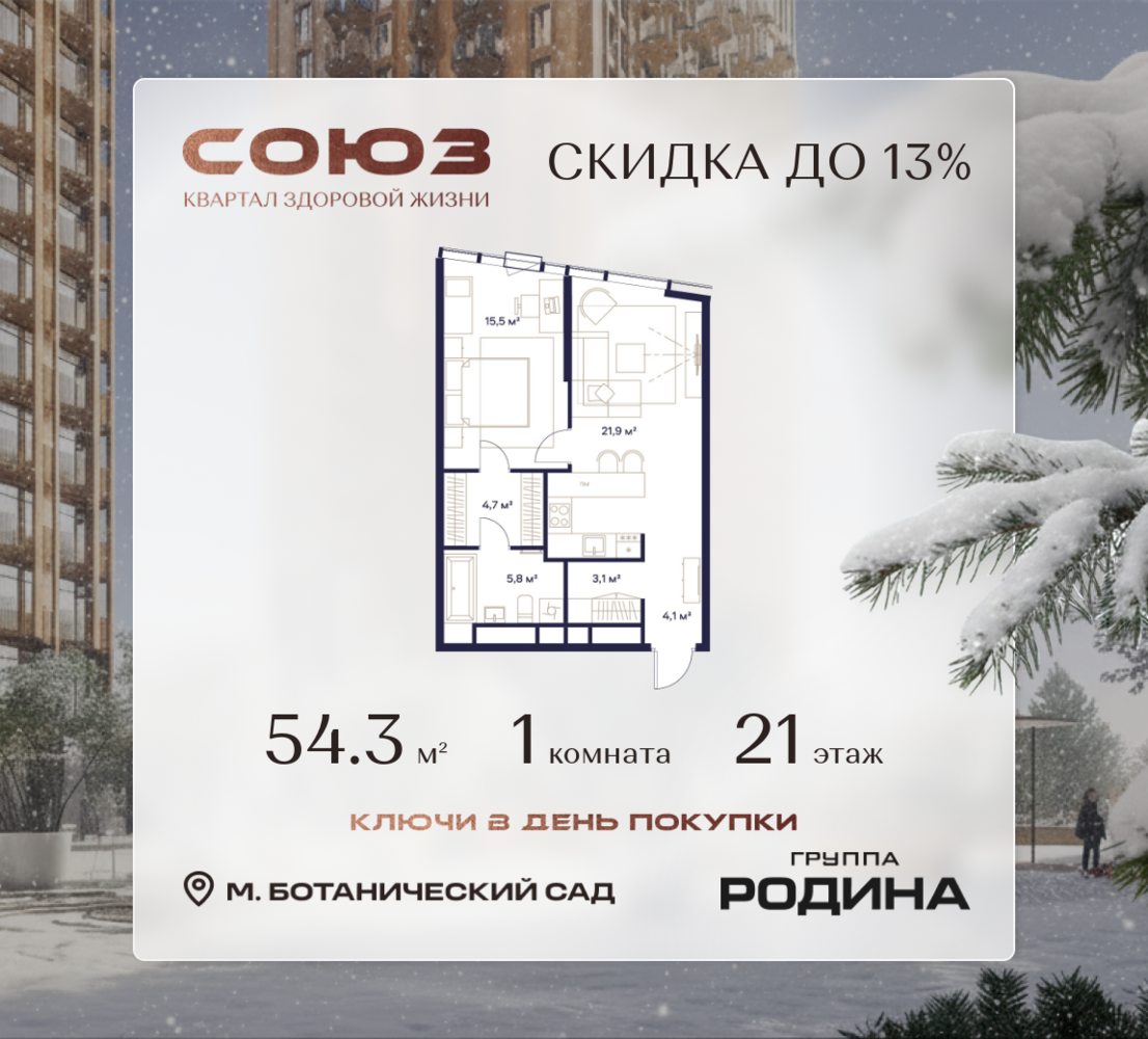 Готовые дома и ключи в день покупки <p> </p> Рассрочка 0% <p> </p> Продаётся 1-комнатная квартира площадью 54.3 м² на 21 этаже в Жилом Комплексе «Союз». <p> </p> Квартал здоровой жизни премиум-класса с рекордным количеством олимпийских видов спорта: <p> </p> - Ледовая арена для хоккея и фигурного катания, - Футбольные поля для тренировок, - Спортивный зал для фехтования, - Бассейн на 6 дорожек, - Центр единоборств, - 4 крытых площадки для настольного тенниса, - 7 теннисных кортов (крытых и открытых), - 4 крытых площадки для сквоша, - Легкоатлетический стадион, - Площадки для баскетбола и волейбола. <p> </p> <p> </p> Уникальные форматы квартир с мастер-спальнями, приватными террасами, балконами, а также пентхаусы с открыточными видами на город. <p> </p> Все квартиры продаются с отделкой Shell&Core и панорамным остеклением. <p> </p> <p> </p> Расположение <p> </p> Пешком: <p> </p> - 2 мин. до парка «Сад Будущего»; - 6 мин. до ст. м. «Ботанический сад»; - 6 мин. до ст. МЦК «Ботанический сад»; - 6 мин. до парка «Леоновская роща»; <p> </p> <p> </p> На автомобиле: <p> </p> - 2 мин. до СВХ (МСД); - 5 мин. до Проспекта Мира; - 10 мин. до ТТК; - 15 мин. до Садового кольца; - 25 мин. до аэропорта «Шереметьево». <p> </p> <p> </p> Благоустройство <p> </p> - собственная спортивная инфраструктура 7 Га; - зона для пикников; - игровые и спортивные площадки для детей всех возрастов; - розарий, а также сосновые, каштановые и дубовые аллеи; - площадки под открытым небом для занятий спортом и йоги; - игровые комнаты для детей; - лаунж-зона для резидентов; - просторная переговорная для деловых встреч; - премиальный ресторан «Шабада» Сосо Павлиашвили с водными арт-объектами на прогулочной аллее, садом ароматных трав и сценой под открытым небом; - кафе, химчистки, аптеки и супермаркеты рядом с домом. <p> </p> <p> </p> Окружение <p> </p> - 8 парков: Сад Будущего, Леоновская роща, Хуамин, Главный ботанический сад РАН, Шереметьевская дубрава, Останкино, парк спорта «Яуза», пойма реки Яуза и музей-усадьба «Останкино»; - 3 ВУЗа: ВГИК, РГСУ, МГПУ; - 12 школ, в том числе: школа 1499 им. И.А. Докукина (топ 100), Brookes Moscow, IThub школа; - 18 детских садов, в том числе билингвальный ALERTUM KIDS; - один из крупнейших океанариумов Европы «Москвариум»; - один из крупнейших в Европе торгово-развлекательных центров «Европолис».