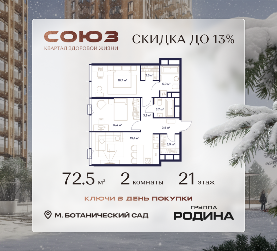 Готовые дома и ключи в день покупки <p> </p> Рассрочка 0% <p> </p> Продаётся 2-комнатная квартира площадью 72.5 м² на 21 этаже в Жилом Комплексе «Союз». <p> </p> Квартал здоровой жизни премиум-класса с рекордным количеством олимпийских видов спорта: <p> </p> - Ледовая арена для хоккея и фигурного катания, - Футбольные поля для тренировок, - Спортивный зал для фехтования, - Бассейн на 6 дорожек, - Центр единоборств, - 4 крытых площадки для настольного тенниса, - 7 теннисных кортов (крытых и открытых), - 4 крытых площадки для сквоша, - Легкоатлетический стадион, - Площадки для баскетбола и волейбола. <p> </p> <p> </p> Уникальные форматы квартир с мастер-спальнями, приватными террасами, балконами, а также пентхаусы с открыточными видами на город. <p> </p> Все квартиры продаются с отделкой Shell&Core и панорамным остеклением. <p> </p> <p> </p> Расположение <p> </p> Пешком: <p> </p> - 2 мин. до парка «Сад Будущего»; - 6 мин. до ст. м. «Ботанический сад»; - 6 мин. до ст. МЦК «Ботанический сад»; - 6 мин. до парка «Леоновская роща»; <p> </p> <p> </p> На автомобиле: <p> </p> - 2 мин. до СВХ (МСД); - 5 мин. до Проспекта Мира; - 10 мин. до ТТК; - 15 мин. до Садового кольца; - 25 мин. до аэропорта «Шереметьево». <p> </p> <p> </p> Благоустройство <p> </p> - собственная спортивная инфраструктура 7 Га; - зона для пикников; - игровые и спортивные площадки для детей всех возрастов; - розарий, а также сосновые, каштановые и дубовые аллеи; - площадки под открытым небом для занятий спортом и йоги; - игровые комнаты для детей; - лаунж-зона для резидентов; - просторная переговорная для деловых встреч; - премиальный ресторан «Шабада» Сосо Павлиашвили с водными арт-объектами на прогулочной аллее, садом ароматных трав и сценой под открытым небом; - кафе, химчистки, аптеки и супермаркеты рядом с домом. <p> </p> <p> </p> Окружение <p> </p> - 8 парков: Сад Будущего, Леоновская роща, Хуамин, Главный ботанический сад РАН, Шереметьевская дубрава, Останкино, парк спорта «Яуза», пойма реки Яуза и музей-усадьба «Останкино»; - 3 ВУЗа: ВГИК, РГСУ, МГПУ; - 12 школ, в том числе: школа 1499 им. И.А. Докукина (топ 100), Brookes Moscow, IThub школа; - 18 детских садов, в том числе билингвальный ALERTUM KIDS; - один из крупнейших океанариумов Европы «Москвариум»; - один из крупнейших в Европе торгово-развлекательных центров «Европолис».