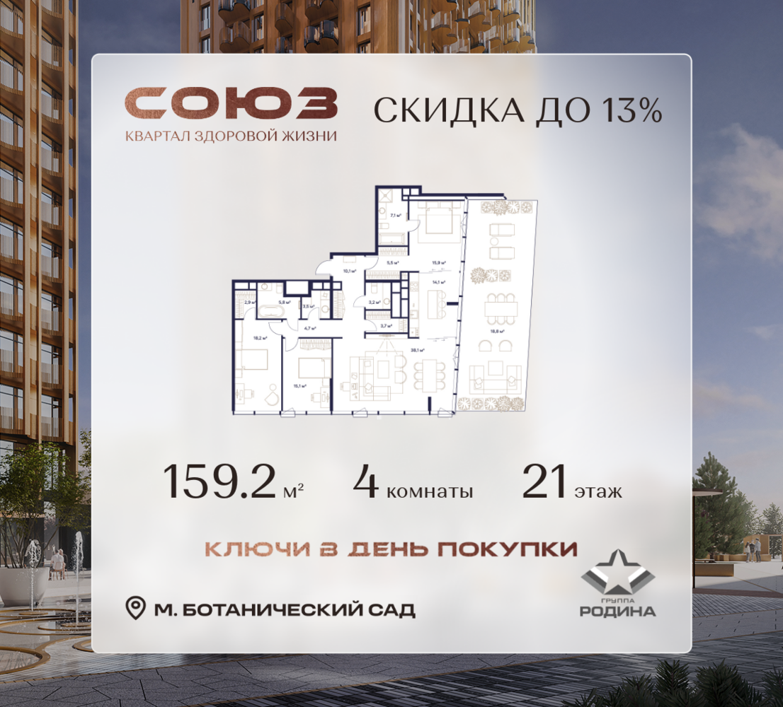 Готовые дома и ключи в день покупки <p> </p> Рассрочка 0% <p> </p> Продаётся 4-комнатная квартира площадью 159.2 м² на 21 этаже в Жилом Комплексе «Союз». <p> </p> Квартал здоровой жизни премиум-класса с рекордным количеством олимпийских видов спорта: <p> </p> - Ледовая арена для хоккея и фигурного катания, - Футбольные поля для тренировок, - Спортивный зал для фехтования, - Бассейн на 6 дорожек, - Центр единоборств, - 4 крытых площадки для настольного тенниса, - 7 теннисных кортов (крытых и открытых), - 4 крытых площадки для сквоша, - Легкоатлетический стадион, - Площадки для баскетбола и волейбола. <p> </p> <p> </p> Уникальные форматы квартир с мастер-спальнями, приватными террасами, балконами, а также пентхаусы с открыточными видами на город. <p> </p> Все квартиры продаются с отделкой Shell&Core и панорамным остеклением. <p> </p> <p> </p> Расположение <p> </p> Пешком: <p> </p> - 2 мин. до парка «Сад Будущего»; - 6 мин. до ст. м. «Ботанический сад»; - 6 мин. до ст. МЦК «Ботанический сад»; - 6 мин. до парка «Леоновская роща»; <p> </p> <p> </p> На автомобиле: <p> </p> - 2 мин. до СВХ (МСД); - 5 мин. до Проспекта Мира; - 10 мин. до ТТК; - 15 мин. до Садового кольца; - 25 мин. до аэропорта «Шереметьево». <p> </p> <p> </p> Благоустройство <p> </p> - собственная спортивная инфраструктура 7 Га; - зона для пикников; - игровые и спортивные площадки для детей всех возрастов; - розарий, а также сосновые, каштановые и дубовые аллеи; - площадки под открытым небом для занятий спортом и йоги; - игровые комнаты для детей; - лаунж-зона для резидентов; - просторная переговорная для деловых встреч; - премиальный ресторан «Шабада» Сосо Павлиашвили с водными арт-объектами на прогулочной аллее, садом ароматных трав и сценой под открытым небом; - кафе, химчистки, аптеки и супермаркеты рядом с домом. <p> </p> <p> </p> Окружение <p> </p> - 8 парков: Сад Будущего, Леоновская роща, Хуамин, Главный ботанический сад РАН, Шереметьевская дубрава, Останкино, парк спорта «Яуза», пойма реки Яуза и музей-усадьба «Останкино»; - 3 ВУЗа: ВГИК, РГСУ, МГПУ; - 12 школ, в том числе: школа 1499 им. И.А. Докукина (топ 100), Brookes Moscow, IThub школа; - 18 детских садов, в том числе билингвальный ALERTUM KIDS; - один из крупнейших океанариумов Европы «Москвариум»; - один из крупнейших в Европе торгово-развлекательных центров «Европолис».