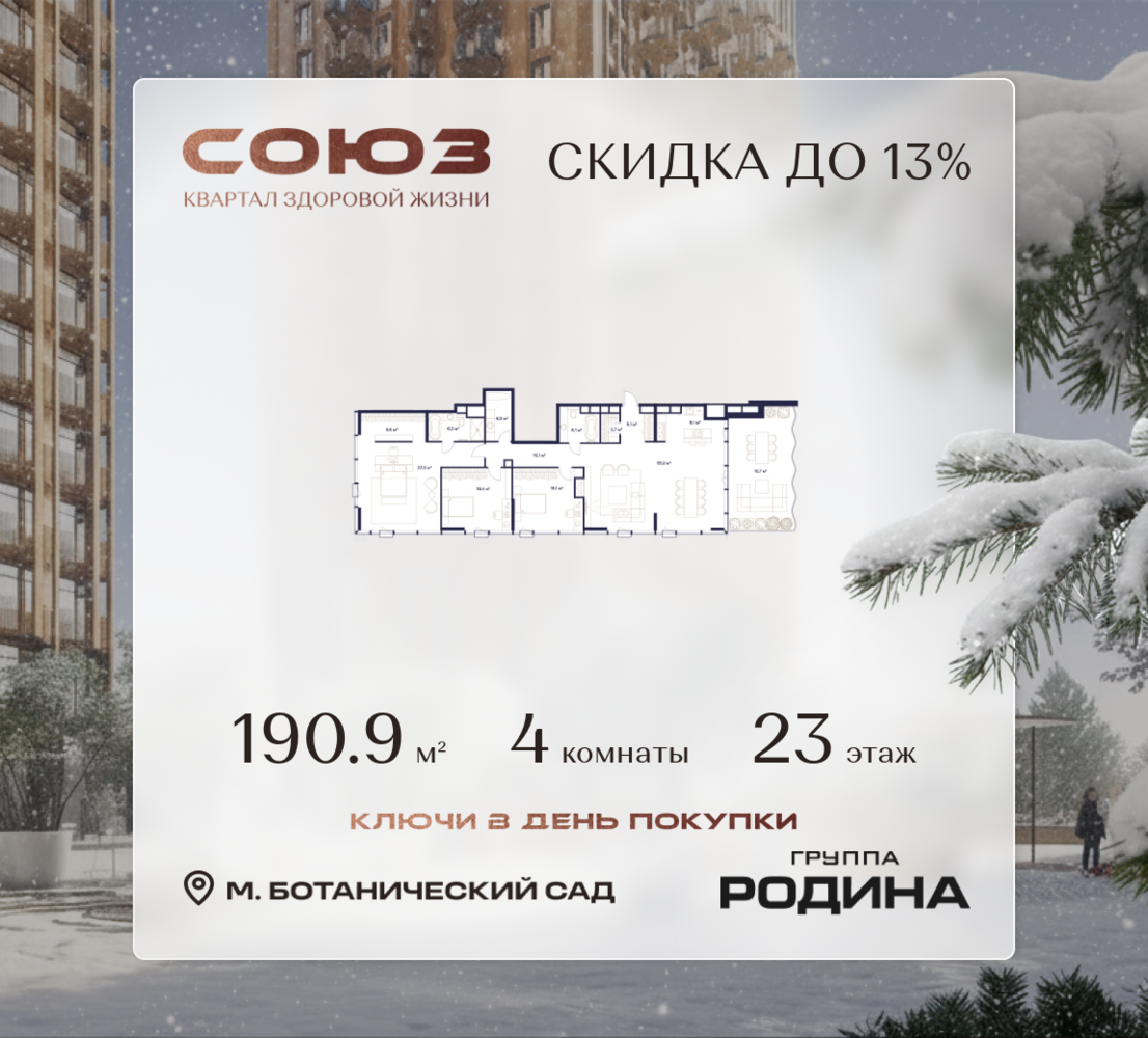 Готовые дома и ключи в день покупки <p> </p> Рассрочка 0% <p> </p> Продаётся 4-комнатная квартира площадью 190.9 м² на 23 этаже в Жилом Комплексе «Союз». <p> </p> Квартал здоровой жизни премиум-класса с рекордным количеством олимпийских видов спорта: <p> </p> - Ледовая арена для хоккея и фигурного катания, - Футбольные поля для тренировок, - Спортивный зал для фехтования, - Бассейн на 6 дорожек, - Центр единоборств, - 4 крытых площадки для настольного тенниса, - 7 теннисных кортов (крытых и открытых), - 4 крытых площадки для сквоша, - Легкоатлетический стадион, - Площадки для баскетбола и волейбола. <p> </p> <p> </p> Уникальные форматы квартир с мастер-спальнями, приватными террасами, балконами, а также пентхаусы с открыточными видами на город. <p> </p> Все квартиры продаются с отделкой Shell&Core и панорамным остеклением. <p> </p> <p> </p> Расположение <p> </p> Пешком: <p> </p> - 2 мин. до парка «Сад Будущего»; - 6 мин. до ст. м. «Ботанический сад»; - 6 мин. до ст. МЦК «Ботанический сад»; - 6 мин. до парка «Леоновская роща»; <p> </p> <p> </p> На автомобиле: <p> </p> - 2 мин. до СВХ (МСД); - 5 мин. до Проспекта Мира; - 10 мин. до ТТК; - 15 мин. до Садового кольца; - 25 мин. до аэропорта «Шереметьево». <p> </p> <p> </p> Благоустройство <p> </p> - собственная спортивная инфраструктура 7 Га; - зона для пикников; - игровые и спортивные площадки для детей всех возрастов; - розарий, а также сосновые, каштановые и дубовые аллеи; - площадки под открытым небом для занятий спортом и йоги; - игровые комнаты для детей; - лаунж-зона для резидентов; - просторная переговорная для деловых встреч; - премиальный ресторан «Шабада» Сосо Павлиашвили с водными арт-объектами на прогулочной аллее, садом ароматных трав и сценой под открытым небом; - кафе, химчистки, аптеки и супермаркеты рядом с домом. <p> </p> <p> </p> Окружение <p> </p> - 8 парков: Сад Будущего, Леоновская роща, Хуамин, Главный ботанический сад РАН, Шереметьевская дубрава, Останкино, парк спорта «Яуза», пойма реки Яуза и музей-усадьба «Останкино»; - 3 ВУЗа: ВГИК, РГСУ, МГПУ; - 12 школ, в том числе: школа 1499 им. И.А. Докукина (топ 100), Brookes Moscow, IThub школа; - 18 детских садов, в том числе билингвальный ALERTUM KIDS; - один из крупнейших океанариумов Европы «Москвариум»; - один из крупнейших в Европе торгово-развлекательных центров «Европолис».