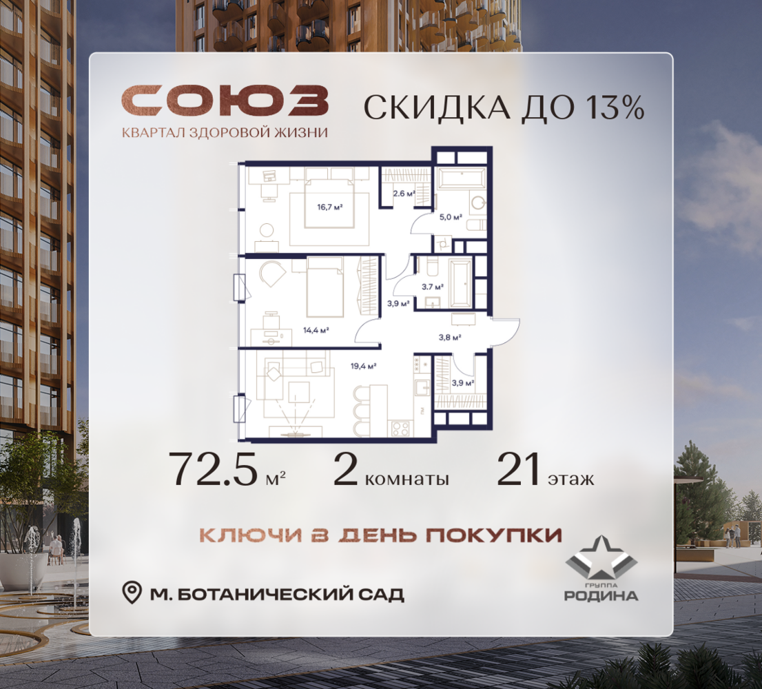 Готовые дома и ключи в день покупки <p> </p> Рассрочка 0% <p> </p> Продаётся 2-комнатная квартира площадью 72.5 м² на 21 этаже в Жилом Комплексе «Союз». <p> </p> Квартал здоровой жизни премиум-класса с рекордным количеством олимпийских видов спорта: <p> </p> - Ледовая арена для хоккея и фигурного катания, - Футбольные поля для тренировок, - Спортивный зал для фехтования, - Бассейн на 6 дорожек, - Центр единоборств, - 4 крытых площадки для настольного тенниса, - 7 теннисных кортов (крытых и открытых), - 4 крытых площадки для сквоша, - Легкоатлетический стадион, - Площадки для баскетбола и волейбола. <p> </p> <p> </p> Уникальные форматы квартир с мастер-спальнями, приватными террасами, балконами, а также пентхаусы с открыточными видами на город. <p> </p> Все квартиры продаются с отделкой Shell&Core и панорамным остеклением. <p> </p> <p> </p> Расположение <p> </p> Пешком: <p> </p> - 2 мин. до парка «Сад Будущего»; - 6 мин. до ст. м. «Ботанический сад»; - 6 мин. до ст. МЦК «Ботанический сад»; - 6 мин. до парка «Леоновская роща»; <p> </p> <p> </p> На автомобиле: <p> </p> - 2 мин. до СВХ (МСД); - 5 мин. до Проспекта Мира; - 10 мин. до ТТК; - 15 мин. до Садового кольца; - 25 мин. до аэропорта «Шереметьево». <p> </p> <p> </p> Благоустройство <p> </p> - собственная спортивная инфраструктура 7 Га; - зона для пикников; - игровые и спортивные площадки для детей всех возрастов; - розарий, а также сосновые, каштановые и дубовые аллеи; - площадки под открытым небом для занятий спортом и йоги; - игровые комнаты для детей; - лаунж-зона для резидентов; - просторная переговорная для деловых встреч; - премиальный ресторан «Шабада» Сосо Павлиашвили с водными арт-объектами на прогулочной аллее, садом ароматных трав и сценой под открытым небом; - кафе, химчистки, аптеки и супермаркеты рядом с домом. <p> </p> <p> </p> Окружение <p> </p> - 8 парков: Сад Будущего, Леоновская роща, Хуамин, Главный ботанический сад РАН, Шереметьевская дубрава, Останкино, парк спорта «Яуза», пойма реки Яуза и музей-усадьба «Останкино»; - 3 ВУЗа: ВГИК, РГСУ, МГПУ; - 12 школ, в том числе: школа 1499 им. И.А. Докукина (топ 100), Brookes Moscow, IThub школа; - 18 детских садов, в том числе билингвальный ALERTUM KIDS; - один из крупнейших океанариумов Европы «Москвариум»; - один из крупнейших в Европе торгово-развлекательных центров «Европолис».