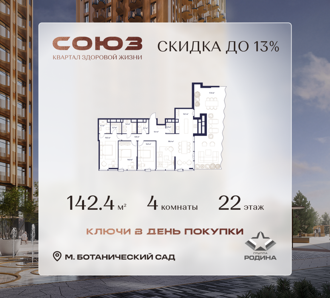 Готовые дома и ключи в день покупки <p> </p> Рассрочка 0% <p> </p> Продаётся 4-комнатная квартира площадью 142.4 м² на 22 этаже в Жилом Комплексе «Союз». <p> </p> Квартал здоровой жизни премиум-класса с рекордным количеством олимпийских видов спорта: <p> </p> - Ледовая арена для хоккея и фигурного катания, - Футбольные поля для тренировок, - Спортивный зал для фехтования, - Бассейн на 6 дорожек, - Центр единоборств, - 4 крытых площадки для настольного тенниса, - 7 теннисных кортов (крытых и открытых), - 4 крытых площадки для сквоша, - Легкоатлетический стадион, - Площадки для баскетбола и волейбола. <p> </p> <p> </p> Уникальные форматы квартир с мастер-спальнями, приватными террасами, балконами, а также пентхаусы с открыточными видами на город. <p> </p> Все квартиры продаются с отделкой Shell&Core и панорамным остеклением. <p> </p> <p> </p> Расположение <p> </p> Пешком: <p> </p> - 2 мин. до парка «Сад Будущего»; - 6 мин. до ст. м. «Ботанический сад»; - 6 мин. до ст. МЦК «Ботанический сад»; - 6 мин. до парка «Леоновская роща»; <p> </p> <p> </p> На автомобиле: <p> </p> - 2 мин. до СВХ (МСД); - 5 мин. до Проспекта Мира; - 10 мин. до ТТК; - 15 мин. до Садового кольца; - 25 мин. до аэропорта «Шереметьево». <p> </p> <p> </p> Благоустройство <p> </p> - собственная спортивная инфраструктура 7 Га; - зона для пикников; - игровые и спортивные площадки для детей всех возрастов; - розарий, а также сосновые, каштановые и дубовые аллеи; - площадки под открытым небом для занятий спортом и йоги; - игровые комнаты для детей; - лаунж-зона для резидентов; - просторная переговорная для деловых встреч; - премиальный ресторан «Шабада» Сосо Павлиашвили с водными арт-объектами на прогулочной аллее, садом ароматных трав и сценой под открытым небом; - кафе, химчистки, аптеки и супермаркеты рядом с домом. <p> </p> <p> </p> Окружение <p> </p> - 8 парков: Сад Будущего, Леоновская роща, Хуамин, Главный ботанический сад РАН, Шереметьевская дубрава, Останкино, парк спорта «Яуза», пойма реки Яуза и музей-усадьба «Останкино»; - 3 ВУЗа: ВГИК, РГСУ, МГПУ; - 12 школ, в том числе: школа 1499 им. И.А. Докукина (топ 100), Brookes Moscow, IThub школа; - 18 детских садов, в том числе билингвальный ALERTUM KIDS; - один из крупнейших океанариумов Европы «Москвариум»; - один из крупнейших в Европе торгово-развлекательных центров «Европолис».