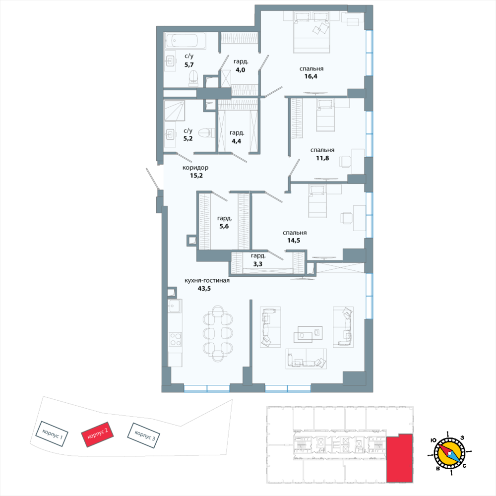 Новая четырехкомнатная квартира в новостройке на 40-м этаже площадью 129.6 кв. м. Премиальный квартал в исторической локации и в трендовом месте, среди зелени парков на престижном западе Москвы, в 10 минутах от Воробьевых гор.