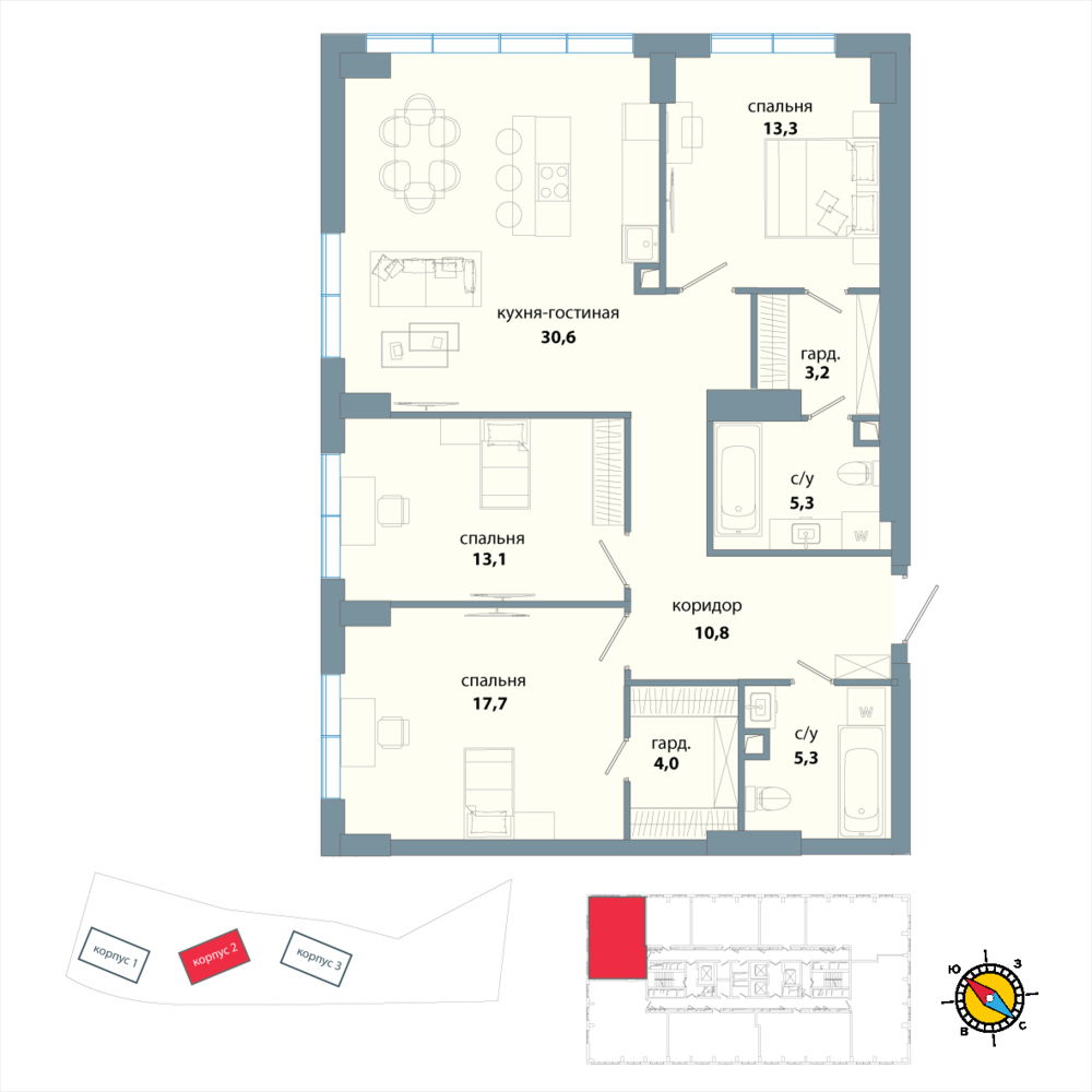 Новая трехкомнатная квартира в новостройке на 43-м этаже площадью 103.3 кв. м. Премиальный квартал в исторической локации и в трендовом месте, среди зелени парков на престижном западе Москвы, в 10 минутах от Воробьевых гор.