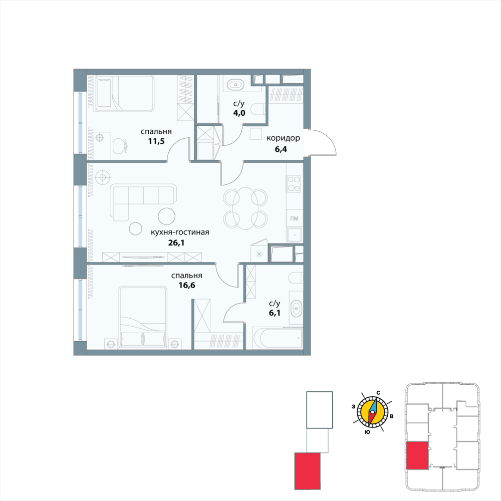 Новая двухкомнатная квартира в новостройке на 16-м этаже площадью 70.7 кв. м. Премиальный квартал в исторической локации и в трендовом месте, среди зелени парков на престижном западе Москвы, в 10 минутах от Воробьевых гор.