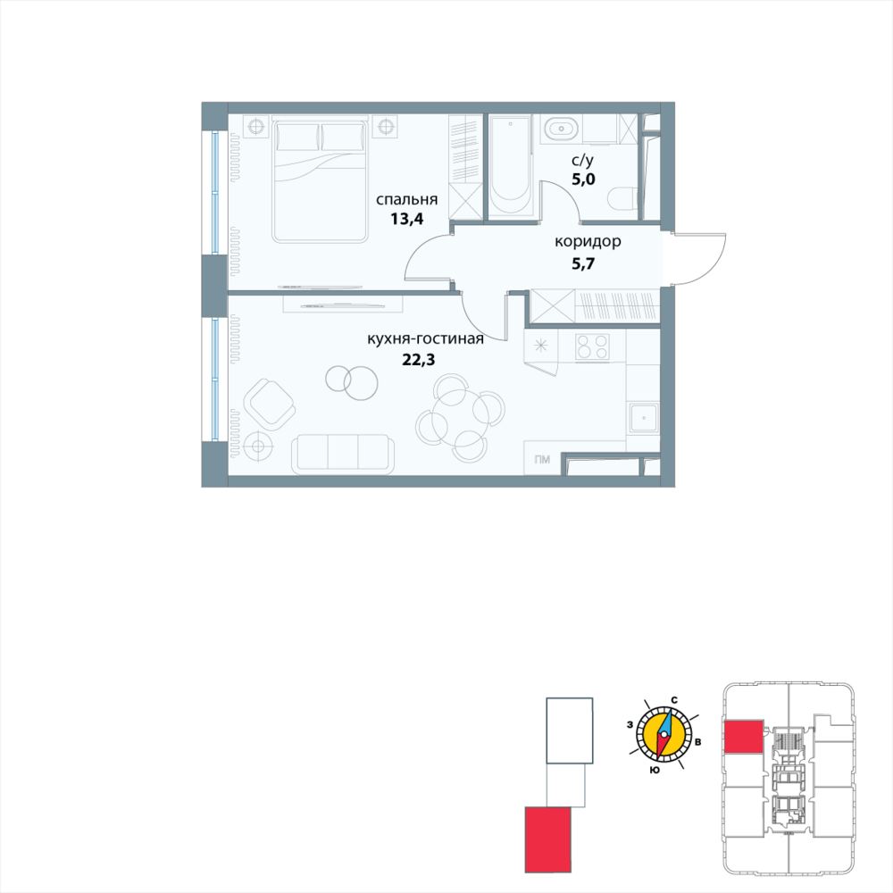 Новая однокомнатная квартира в новостройке на 19-м этаже площадью 46.4 кв. м. Премиальный квартал в исторической локации и в трендовом месте, среди зелени парков на престижном западе Москвы, в 10 минутах от Воробьевых гор.
