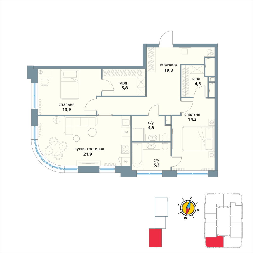 Новая двухкомнатная квартира в новостройке на 21-м этаже площадью 88.5 кв. м. Премиальный квартал в исторической локации и в трендовом месте, среди зелени парков на престижном западе Москвы, в 10 минутах от Воробьевых гор.