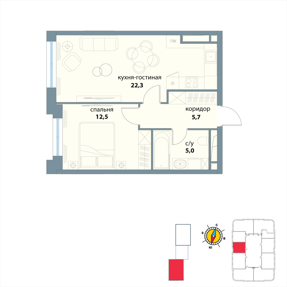 Новая однокомнатная квартира в новостройке на 21-м этаже площадью 45.5 кв. м. Премиальный квартал в исторической локации и в трендовом месте, среди зелени парков на престижном западе Москвы, в 10 минутах от Воробьевых гор.