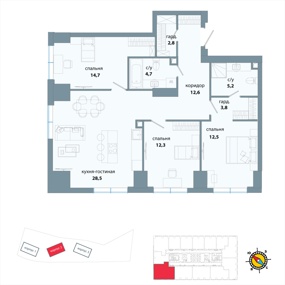 Новая трехкомнатная квартира в новостройке на 3-м этаже площадью 97.1 кв. м. Премиальный квартал в исторической локации и в трендовом месте, среди зелени парков на престижном западе Москвы, в 10 минутах от Воробьевых гор.