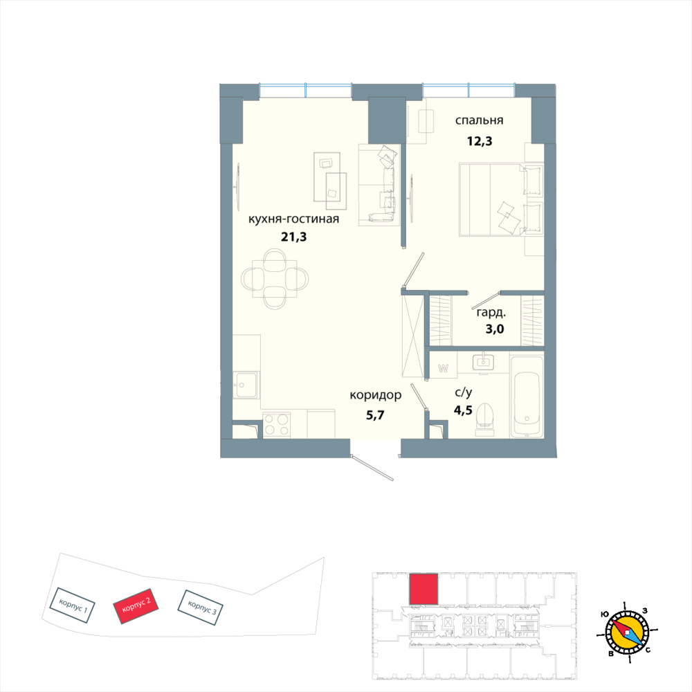 Новая однокомнатная квартира в новостройке на 4-м этаже площадью 46.8 кв. м. Премиальный квартал в исторической локации и в трендовом месте, среди зелени парков на престижном западе Москвы, в 10 минутах от Воробьевых гор.