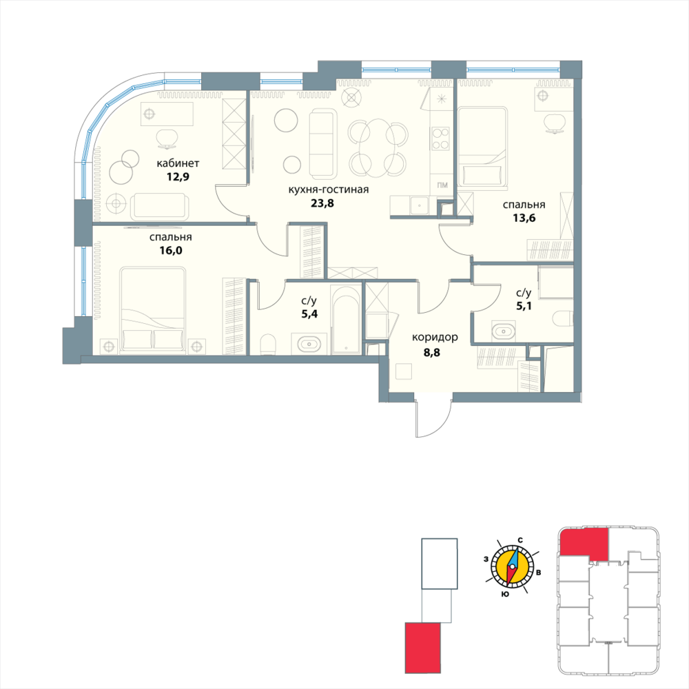 Новая трехкомнатная квартира в новостройке на 27-м этаже площадью 85.6 кв. м. Премиальный квартал в исторической локации и в трендовом месте, среди зелени парков на престижном западе Москвы, в 10 минутах от Воробьевых гор.