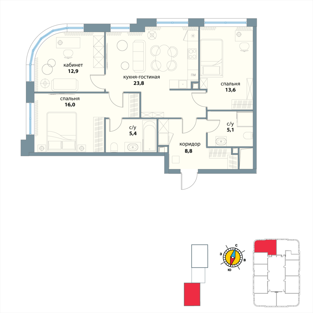 Новая трехкомнатная квартира в новостройке на 30-м этаже площадью 85.6 кв. м. Премиальный квартал в исторической локации и в трендовом месте, среди зелени парков на престижном западе Москвы, в 10 минутах от Воробьевых гор.