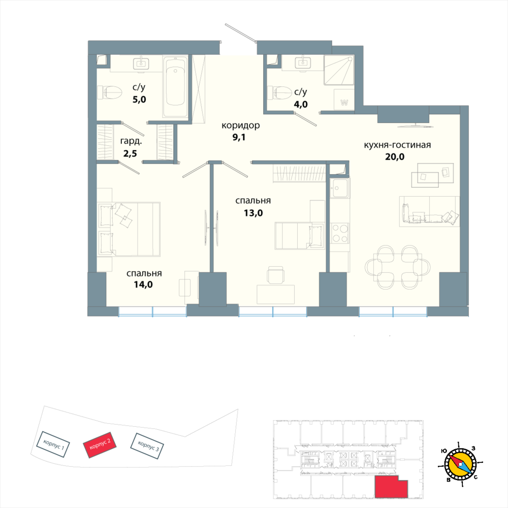 Новая двухкомнатная квартира в новостройке на 5-м этаже площадью 67.6 кв. м. Премиальный квартал в исторической локации и в трендовом месте, среди зелени парков на престижном западе Москвы, в 10 минутах от Воробьевых гор.
