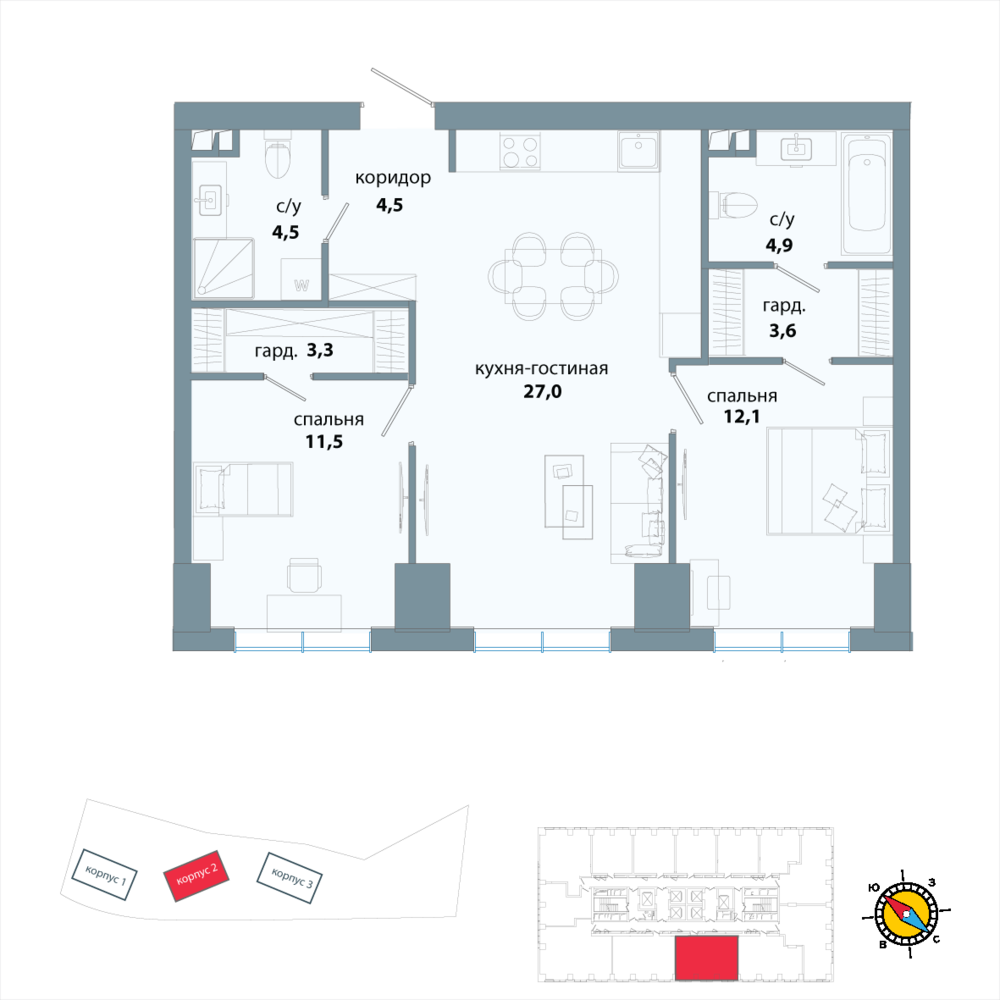 Новая двухкомнатная квартира в новостройке на 2-м этаже площадью 71.4 кв. м. Премиальный квартал в исторической локации и в трендовом месте, среди зелени парков на престижном западе Москвы, в 10 минутах от Воробьевых гор.