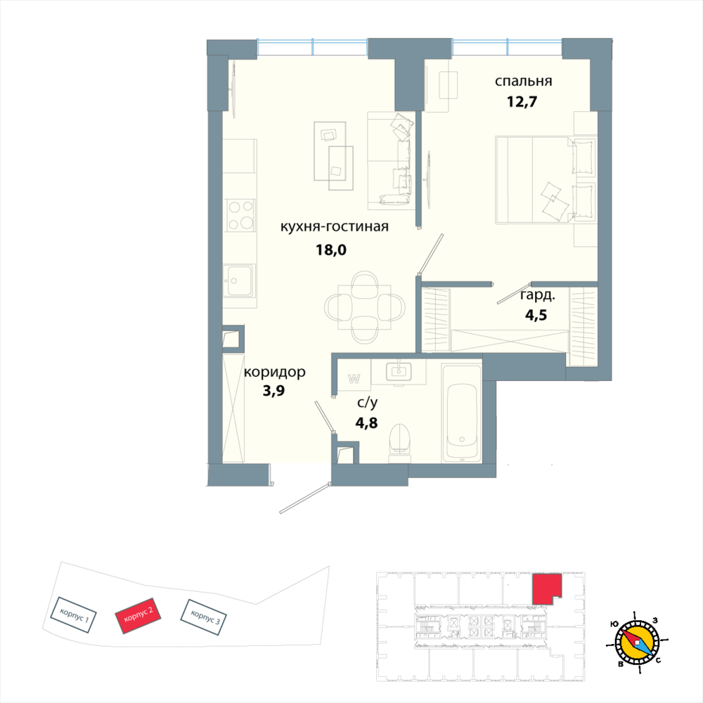Новая однокомнатная квартира в новостройке на 22-м этаже площадью 43.9 кв. м. Премиальный квартал в исторической локации и в трендовом месте, среди зелени парков на престижном западе Москвы, в 10 минутах от Воробьевых гор.