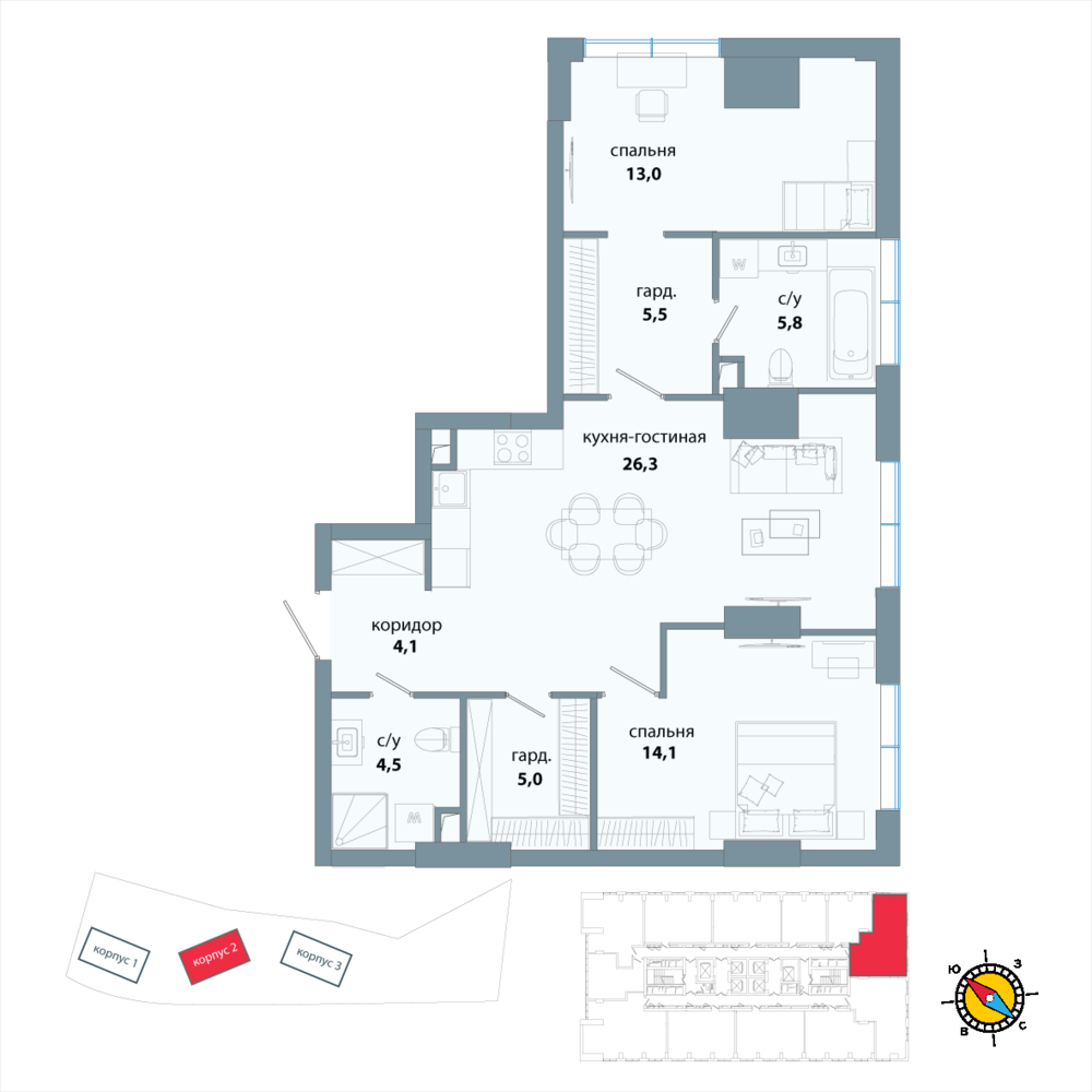 Новая двухкомнатная квартира в новостройке на 24-м этаже площадью 78.3 кв. м. Премиальный квартал в исторической локации и в трендовом месте, среди зелени парков на престижном западе Москвы, в 10 минутах от Воробьевых гор.