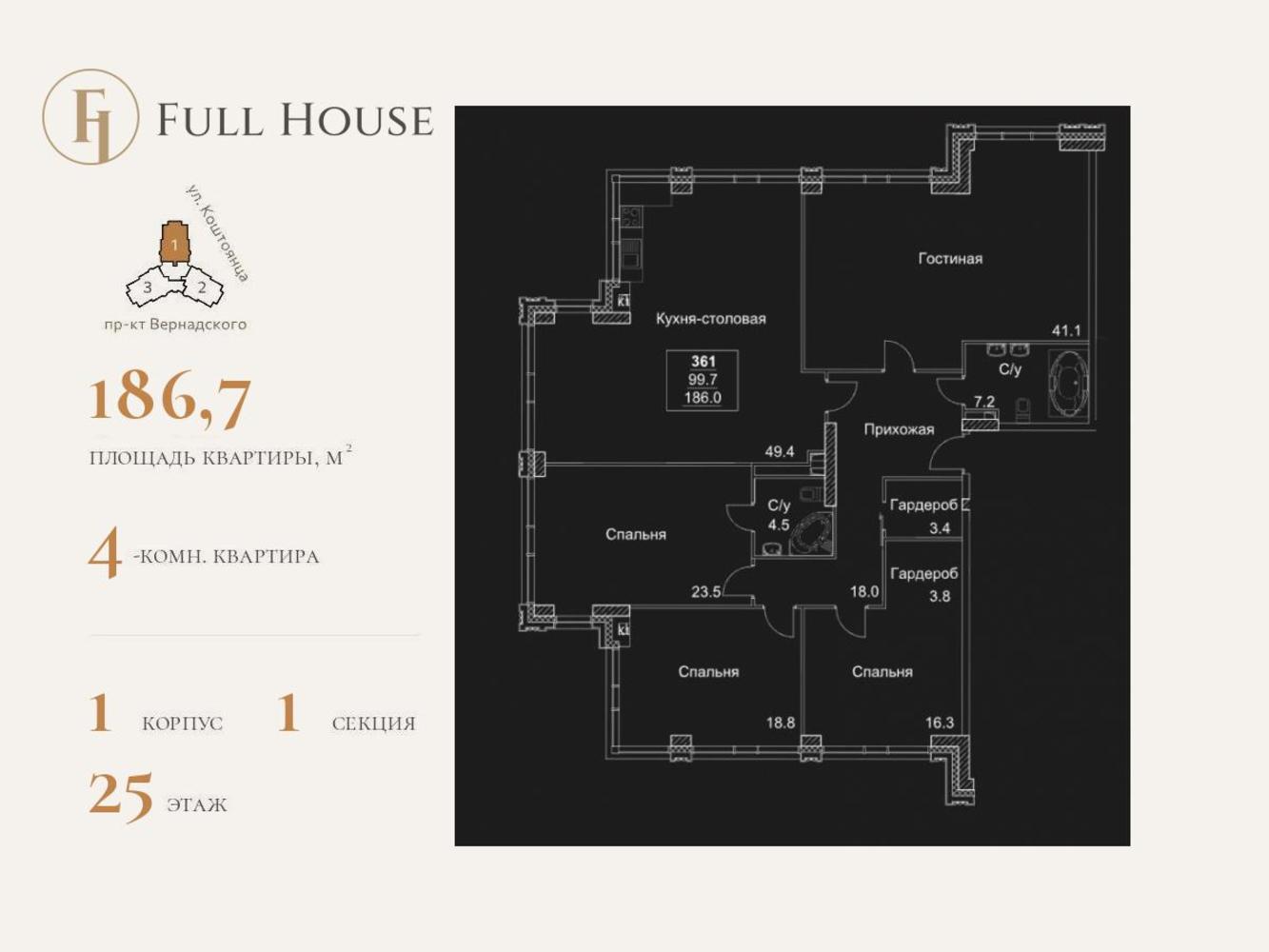 Продается 4-комнатная квартира в ЖК Full House на 25 этаже. Общая площадь квартиры составляет 186,7 кв.м. Квартира без отделки. Жилой комплекс сдан! Жилой комплекс Full House — это идеальное сочетание роскошной инфраструктуры, совершенства инженерных систем и привилегий клубного дома со своей неповторимой камерной атмосферой. Воплощение архитектурной мечты Монументальная классика элегантных линий клубного дома Full House органично вписалась в старомосковскую архитектуру Юго-Западного района — одного из самых востребованных районов столицы. У архитекторов проекта получилось изящно переплести элементы строгого ампира и смелого ар-деко, а фасады из натурального камня добавляют зданию нотки аристократичности. А бонусом к архитектурному совершенству идет возможность построить собственный идеальный мир в своей квартире — они продаются без отделки, со свободной планировкой и возможностью соединить несколько квартир в одно большое пространство. Только для своих Клубная концепция Full House гарантирует отсутствие случайных людей в закрытом интеллигентном коммьюнити и служит залогом абсолютной приватности и безопасности. Закрытая и охраняемая территория жилого комплекса оборудована надежной системой видеонаблюдения, поэтому можно не переживать за детей, играющих на детских площадках. Жемчужина клубного дома — приватный парк, который спрятался от глаз посторонних на стилобатной кровле комплекса. Это роскошный вечнозеленый оазис с естественным природным ландшафтом, спортивными площадками и аллеями для вечерних променадов и утренних пробежек. Жизнь класса Deluxe Full House можно назвать эталоном бытового комфорта. Кроме трехметровых потолков и витражного остекленения в каждой квартире, вас ждет совершенство инженерных систем во всем здании, высший класс энергоэффективности комплекса и комфортабельное лобби с авторским дизайном. Кстати, вашим домашним питомцам лобби тоже понравится — для них оборудована лапомойка, чтобы можно было смыть грязь после прогулки. На первых этажах клубного дома разместились магазины, салоны красоты и другие необходимые службы и сервисы, поэтому при желании можно жить, не покидая территорию комплекса. Но для этого нет причин - Full House окружен прекрасными парками, зелеными зонами и архитектурными памятниками прошлых лет. В этом районе сохранилась атмосфера старой Москвы, которая так нравится туристам и гостям города и вдохновляет на неспешные прогулки старожилов столицы. Позвоните сегодня в офис продаж, и мы с удовольствием пригласим вас в гости. Менеджер подробно расскажет о преимуществах жилого комплекса за чашкой ароматного кофе.