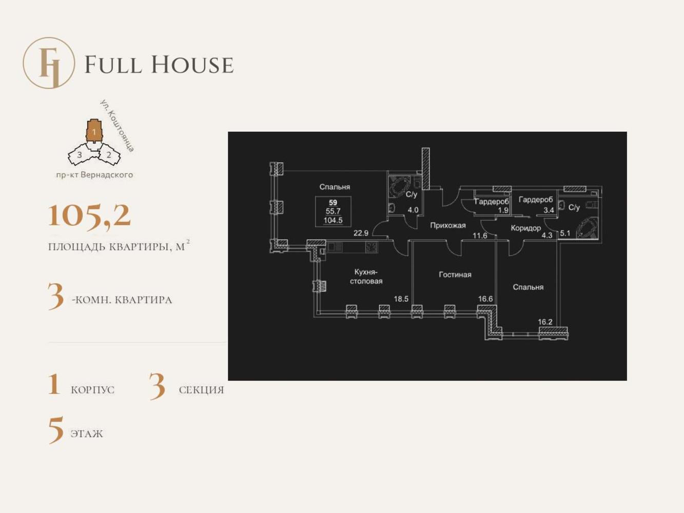 Продается 3-комнатная квартира в ЖК Full House на 5 этаже. Общая площадь квартиры составляет 105,2 кв.м. Квартира без отделки. Жилой комплекс сдан! Жилой комплекс Full House — это идеальное сочетание роскошной инфраструктуры, совершенства инженерных систем и привилегий клубного дома со своей неповторимой камерной атмосферой. Воплощение архитектурной мечты Монументальная классика элегантных линий клубного дома Full House органично вписалась в старомосковскую архитектуру Юго-Западного района — одного из самых востребованных районов столицы. У архитекторов проекта получилось изящно переплести элементы строгого ампира и смелого ар-деко, а фасады из натурального камня добавляют зданию нотки аристократичности. А бонусом к архитектурному совершенству идет возможность построить собственный идеальный мир в своей квартире — они продаются без отделки, со свободной планировкой и возможностью соединить несколько квартир в одно большое пространство. Только для своих Клубная концепция Full House гарантирует отсутствие случайных людей в закрытом интеллигентном коммьюнити и служит залогом абсолютной приватности и безопасности. Закрытая и охраняемая территория жилого комплекса оборудована надежной системой видеонаблюдения, поэтому можно не переживать за детей, играющих на детских площадках. Жемчужина клубного дома — приватный парк, который спрятался от глаз посторонних на стилобатной кровле комплекса. Это роскошный вечнозеленый оазис с естественным природным ландшафтом, спортивными площадками и аллеями для вечерних променадов и утренних пробежек. Жизнь класса Deluxe Full House можно назвать эталоном бытового комфорта. Кроме трехметровых потолков и витражного остекленения в каждой квартире, вас ждет совершенство инженерных систем во всем здании, высший класс энергоэффективности комплекса и комфортабельное лобби с авторским дизайном. Кстати, вашим домашним питомцам лобби тоже понравится — для них оборудована лапомойка, чтобы можно было смыть грязь после прогулки. На первых этажах клубного дома разместились магазины, салоны красоты и другие необходимые службы и сервисы, поэтому при желании можно жить, не покидая территорию комплекса. Но для этого нет причин - Full House окружен прекрасными парками, зелеными зонами и архитектурными памятниками прошлых лет. В этом районе сохранилась атмосфера старой Москвы, которая так нравится туристам и гостям города и вдохновляет на неспешные прогулки старожилов столицы. Позвоните сегодня в офис продаж, и мы с удовольствием пригласим вас в гости. Менеджер подробно расскажет о преимуществах жилого комплекса за чашкой ароматного кофе.