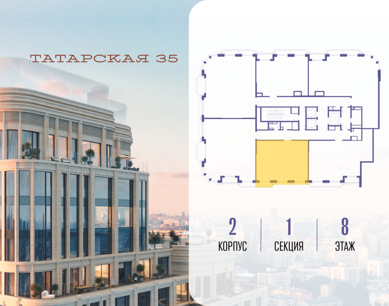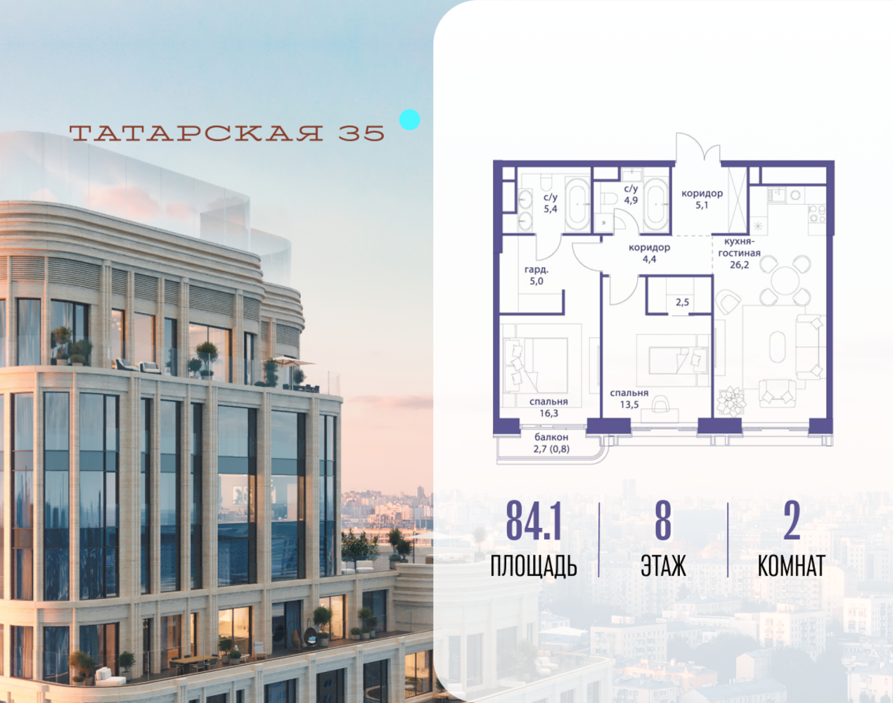 Продается просторная квартира площадью 84.10 м2 в жилом комплексе ТАТАРСКАЯ, 35. Квартира находится в 1 секции корпуса 2. Этаж 8-й из 19. Квартира без чистовой отделки, с просторной кухней 26.20 м2. Жилая площадь ― 29.80 м2. Высота потолка от 3.50. ТАТАРСКАЯ, 35 - новая архитектурная доминанта Замоскворечья, достопримечательность на фотопанорамах исторического центра Москвы. Элитный дом, созданный для тех, кто умеет смотреть далеко вперед, мыслить масштабно и воплощать собственный сценарий жизни. Вдохновляющие прогулки по променаду набережной, в уютных переулках, в парке «Зарядье», в Михайловском саду и Репинском сквере. Наслаждение высоким искусством в Третьяковской галерее, Доме Музыки, театральном музее им. А.А. Бахрушина, театре на Малой Ордынке. За окнами - Кремль, высотка на Котельнической, панорамы Замоскворечья и острова Балчуг, огни Садового кольца. Собственные спорт-румы, детская, репетиторская, бьюти-пространства, деловое пространство с коворкингом, переговорной и сигарной. Собственный трехуровневый фитнесс-центр с бассейном, тренажерным залом, сауной, хаммамом, массажным кабинетом. Площадь двора – 1,8 га, половина территории покрыта деревьями, кустарниками и лужайками. Дом расположен внутри Садового кольца – отсюда в считанные минуты можно добраться до важнейших мест столицы: достопримечательностей и парков, театров и ресторанов, деловых и административных центров. 7 минут до Кремля на автомобиле, 15 минут до Третьяковской галереи и 8 минут до Садового кольца пешком. Планировочные решения и визуализации предварительны, возможны изменения.