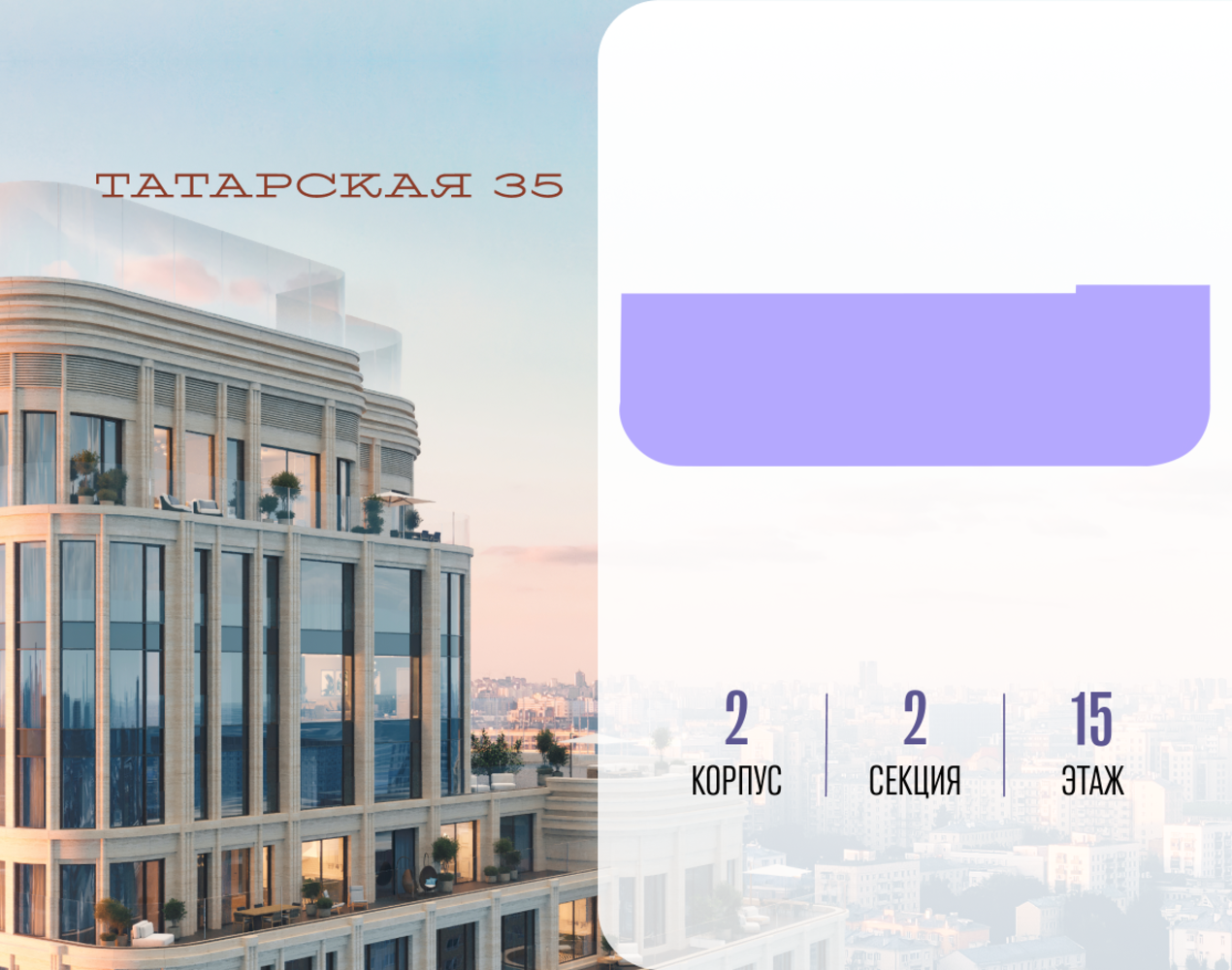 Продается просторная квартира площадью 227.60 м2 в жилом комплексе ТАТАРСКАЯ, 35. Квартира находится в 2 секции корпуса 2. Этаж 15-й из 19. Квартира без чистовой отделки, с просторной кухней 53.70 м2. Жилая площадь ― 101.50 м2. Высота потолка от 3.50. ТАТАРСКАЯ, 35 - новая архитектурная доминанта Замоскворечья, достопримечательность на фотопанорамах исторического центра Москвы. Элитный дом, созданный для тех, кто умеет смотреть далеко вперед, мыслить масштабно и воплощать собственный сценарий жизни. Вдохновляющие прогулки по променаду набережной, в уютных переулках, в парке «Зарядье», в Михайловском саду и Репинском сквере. Наслаждение высоким искусством в Третьяковской галерее, Доме Музыки, театральном музее им. А.А. Бахрушина, театре на Малой Ордынке. За окнами - Кремль, высотка на Котельнической, панорамы Замоскворечья и острова Балчуг, огни Садового кольца. Собственные спорт-румы, детская, репетиторская, бьюти-пространства, деловое пространство с коворкингом, переговорной и сигарной. Собственный трехуровневый фитнесс-центр с бассейном, тренажерным залом, сауной, хаммамом, массажным кабинетом. Площадь двора – 1,8 га, половина территории покрыта деревьями, кустарниками и лужайками. Дом расположен внутри Садового кольца – отсюда в считанные минуты можно добраться до важнейших мест столицы: достопримечательностей и парков, театров и ресторанов, деловых и административных центров. 7 минут до Кремля на автомобиле, 15 минут до Третьяковской галереи и 8 минут до Садового кольца пешком. Планировочные решения и визуализации предварительны, возможны изменения.