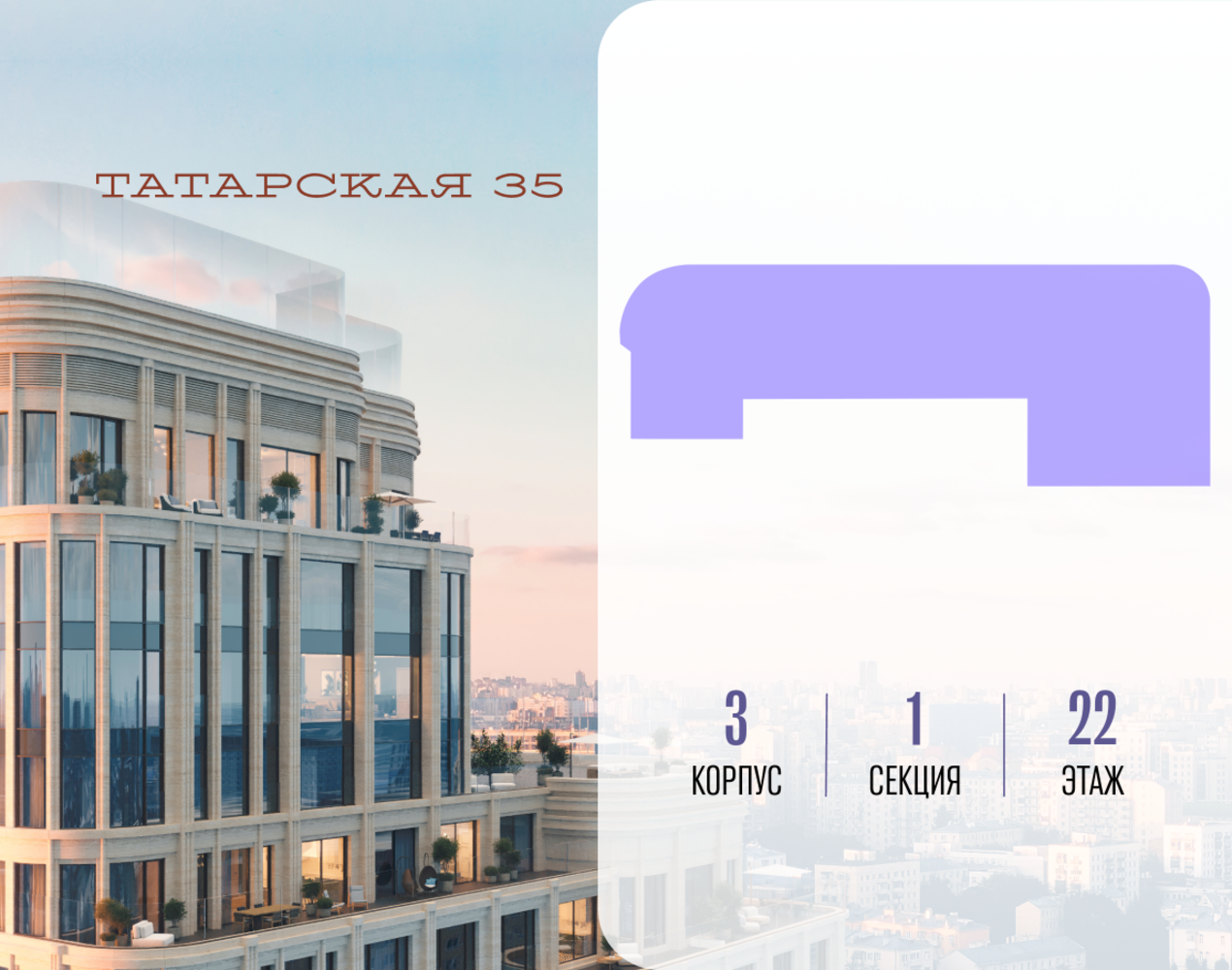 Продается просторная квартира площадью 188.60 м2 в жилом комплексе ТАТАРСКАЯ, 35. Квартира находится в 1 секции корпуса 3. Этаж 22-й из 24. Квартира без чистовой отделки, с просторной кухней 49.30 м2. Жилая площадь ― 63.80 м2. Высота потолка от 3.50. ТАТАРСКАЯ, 35 - новая архитектурная доминанта Замоскворечья, достопримечательность на фотопанорамах исторического центра Москвы. Элитный дом, созданный для тех, кто умеет смотреть далеко вперед, мыслить масштабно и воплощать собственный сценарий жизни. Вдохновляющие прогулки по променаду набережной, в уютных переулках, в парке «Зарядье», в Михайловском саду и Репинском сквере. Наслаждение высоким искусством в Третьяковской галерее, Доме Музыки, театральном музее им. А.А. Бахрушина, театре на Малой Ордынке. За окнами - Кремль, высотка на Котельнической, панорамы Замоскворечья и острова Балчуг, огни Садового кольца. Собственные спорт-румы, детская, репетиторская, бьюти-пространства, деловое пространство с коворкингом, переговорной и сигарной. Собственный трехуровневый фитнесс-центр с бассейном, тренажерным залом, сауной, хаммамом, массажным кабинетом. Площадь двора – 1,8 га, половина территории покрыта деревьями, кустарниками и лужайками. Дом расположен внутри Садового кольца – отсюда в считанные минуты можно добраться до важнейших мест столицы: достопримечательностей и парков, театров и ресторанов, деловых и административных центров. 7 минут до Кремля на автомобиле, 15 минут до Третьяковской галереи и 8 минут до Садового кольца пешком. Планировочные решения и визуализации предварительны, возможны изменения.