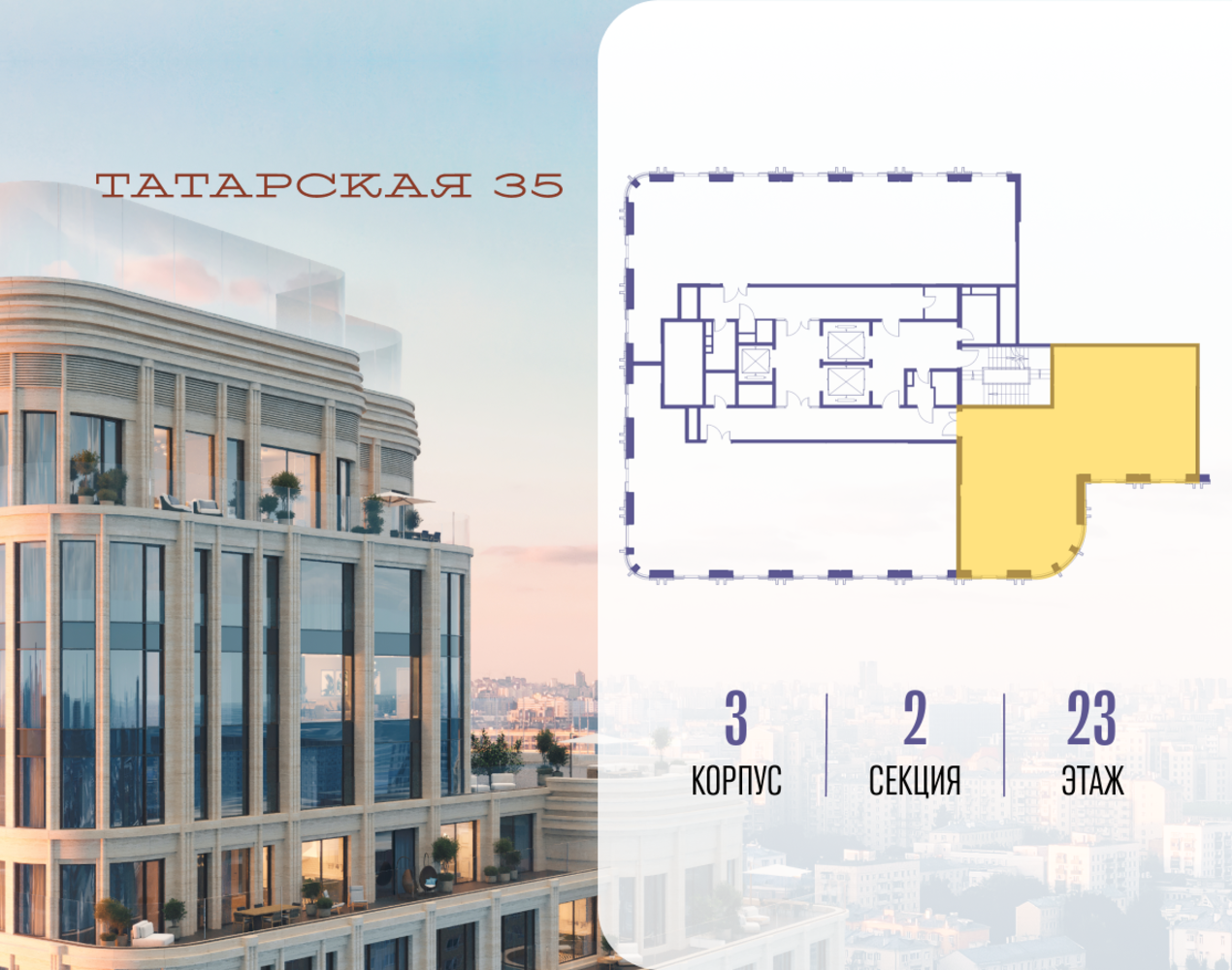 Продается просторная квартира площадью 118.20 м2 в жилом комплексе ТАТАРСКАЯ, 35. Квартира находится в 2 секции корпуса 3. Этаж 23-й из 23. Квартира без чистовой отделки, с просторной кухней 52.20 м2. Жилая площадь ― 33.10 м2. Высота потолка от 3.50. ТАТАРСКАЯ, 35 - новая архитектурная доминанта Замоскворечья, достопримечательность на фотопанорамах исторического центра Москвы. Элитный дом, созданный для тех, кто умеет смотреть далеко вперед, мыслить масштабно и воплощать собственный сценарий жизни. Вдохновляющие прогулки по променаду набережной, в уютных переулках, в парке «Зарядье», в Михайловском саду и Репинском сквере. Наслаждение высоким искусством в Третьяковской галерее, Доме Музыки, театральном музее им. А.А. Бахрушина, театре на Малой Ордынке. За окнами - Кремль, высотка на Котельнической, панорамы Замоскворечья и острова Балчуг, огни Садового кольца. Собственные спорт-румы, детская, репетиторская, бьюти-пространства, деловое пространство с коворкингом, переговорной и сигарной. Собственный трехуровневый фитнесс-центр с бассейном, тренажерным залом, сауной, хаммамом, массажным кабинетом. Площадь двора – 1,8 га, половина территории покрыта деревьями, кустарниками и лужайками. Дом расположен внутри Садового кольца – отсюда в считанные минуты можно добраться до важнейших мест столицы: достопримечательностей и парков, театров и ресторанов, деловых и административных центров. 7 минут до Кремля на автомобиле, 15 минут до Третьяковской галереи и 8 минут до Садового кольца пешком. Планировочные решения и визуализации предварительны, возможны изменения.