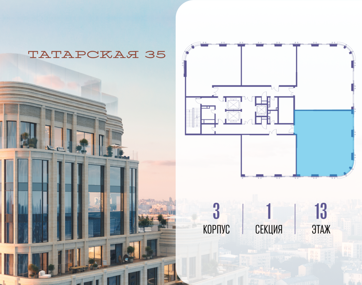 Продается просторная квартира площадью 128.90 м2 в жилом комплексе ТАТАРСКАЯ, 35. Квартира находится в 1 секции корпуса 3. Этаж 13-й из 24. Квартира без чистовой отделки, с просторной кухней 41.90 м2. Жилая площадь ― 44.70 м2. Высота потолка от 3.50. ТАТАРСКАЯ, 35 - новая архитектурная доминанта Замоскворечья, достопримечательность на фотопанорамах исторического центра Москвы. Элитный дом, созданный для тех, кто умеет смотреть далеко вперед, мыслить масштабно и воплощать собственный сценарий жизни. Вдохновляющие прогулки по променаду набережной, в уютных переулках, в парке «Зарядье», в Михайловском саду и Репинском сквере. Наслаждение высоким искусством в Третьяковской галерее, Доме Музыки, театральном музее им. А.А. Бахрушина, театре на Малой Ордынке. За окнами - Кремль, высотка на Котельнической, панорамы Замоскворечья и острова Балчуг, огни Садового кольца. Собственные спорт-румы, детская, репетиторская, бьюти-пространства, деловое пространство с коворкингом, переговорной и сигарной. Собственный трехуровневый фитнесс-центр с бассейном, тренажерным залом, сауной, хаммамом, массажным кабинетом. Площадь двора – 1,8 га, половина территории покрыта деревьями, кустарниками и лужайками. Дом расположен внутри Садового кольца – отсюда в считанные минуты можно добраться до важнейших мест столицы: достопримечательностей и парков, театров и ресторанов, деловых и административных центров. 7 минут до Кремля на автомобиле, 15 минут до Третьяковской галереи и 8 минут до Садового кольца пешком. Планировочные решения и визуализации предварительны, возможны изменения.