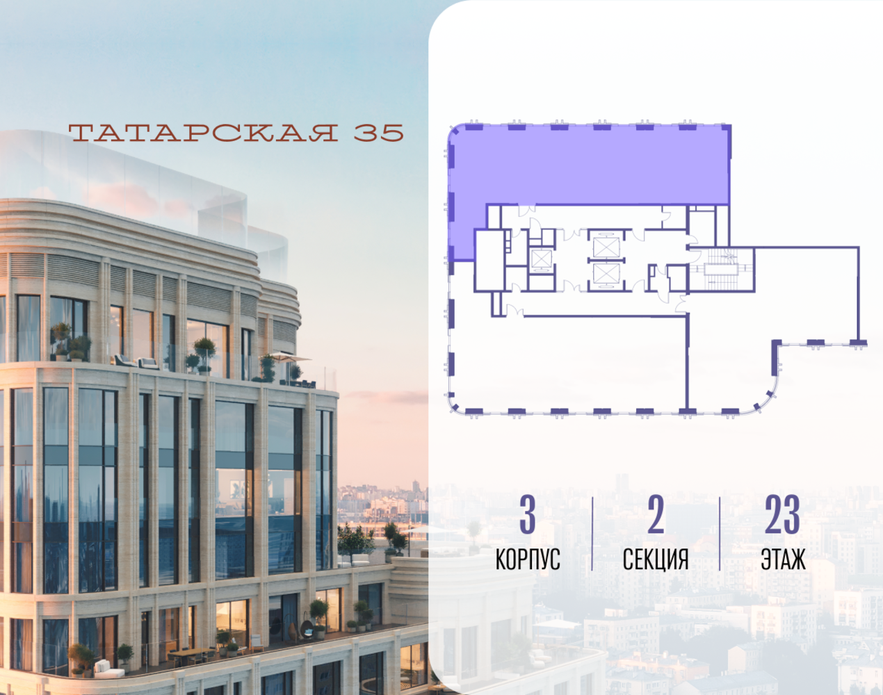 Продается просторная квартира площадью 139.60 м2 в жилом комплексе ТАТАРСКАЯ, 35. Квартира находится в 2 секции корпуса 3. Этаж 23-й из 23. Квартира без чистовой отделки, с просторной кухней 56.70 м2. Жилая площадь ― 56.50 м2. Высота потолка от 3.50. ТАТАРСКАЯ, 35 - новая архитектурная доминанта Замоскворечья, достопримечательность на фотопанорамах исторического центра Москвы. Элитный дом, созданный для тех, кто умеет смотреть далеко вперед, мыслить масштабно и воплощать собственный сценарий жизни. Вдохновляющие прогулки по променаду набережной, в уютных переулках, в парке «Зарядье», в Михайловском саду и Репинском сквере. Наслаждение высоким искусством в Третьяковской галерее, Доме Музыки, театральном музее им. А.А. Бахрушина, театре на Малой Ордынке. За окнами - Кремль, высотка на Котельнической, панорамы Замоскворечья и острова Балчуг, огни Садового кольца. Собственные спорт-румы, детская, репетиторская, бьюти-пространства, деловое пространство с коворкингом, переговорной и сигарной. Собственный трехуровневый фитнесс-центр с бассейном, тренажерным залом, сауной, хаммамом, массажным кабинетом. Площадь двора – 1,8 га, половина территории покрыта деревьями, кустарниками и лужайками. Дом расположен внутри Садового кольца – отсюда в считанные минуты можно добраться до важнейших мест столицы: достопримечательностей и парков, театров и ресторанов, деловых и административных центров. 7 минут до Кремля на автомобиле, 15 минут до Третьяковской галереи и 8 минут до Садового кольца пешком. Планировочные решения и визуализации предварительны, возможны изменения.