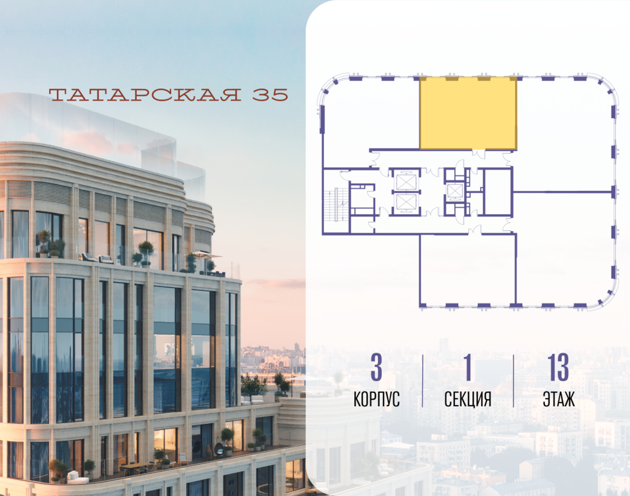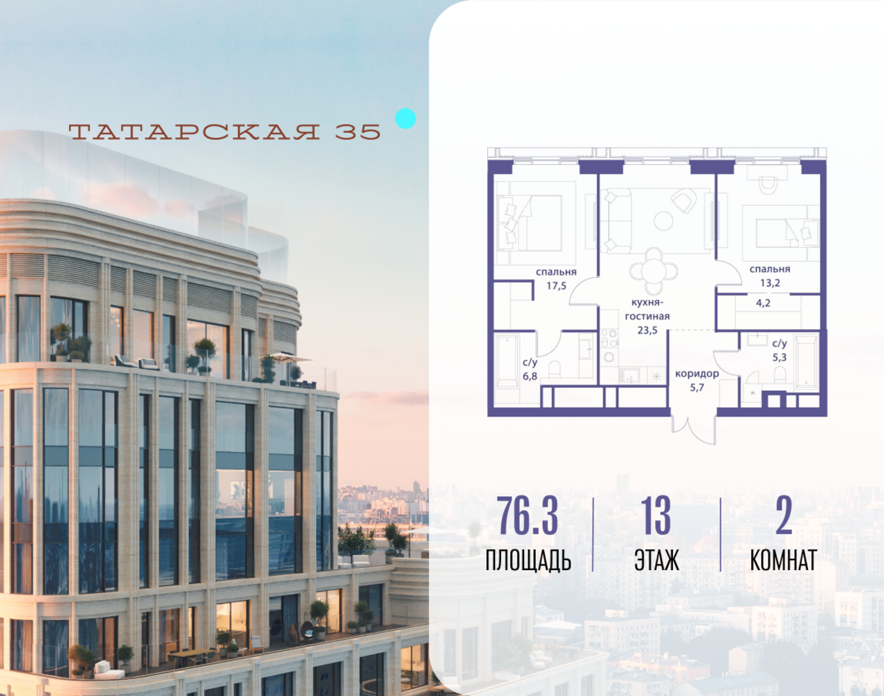 Продается просторная квартира площадью 76.30 м2 в жилом комплексе ТАТАРСКАЯ, 35. Квартира находится в 1 секции корпуса 3. Этаж 13-й из 24. Квартира без чистовой отделки, с просторной кухней 23.50 м2. Жилая площадь ― 30.70 м2. Высота потолка от 3.50. ТАТАРСКАЯ, 35 - новая архитектурная доминанта Замоскворечья, достопримечательность на фотопанорамах исторического центра Москвы. Элитный дом, созданный для тех, кто умеет смотреть далеко вперед, мыслить масштабно и воплощать собственный сценарий жизни. Вдохновляющие прогулки по променаду набережной, в уютных переулках, в парке «Зарядье», в Михайловском саду и Репинском сквере. Наслаждение высоким искусством в Третьяковской галерее, Доме Музыки, театральном музее им. А.А. Бахрушина, театре на Малой Ордынке. За окнами - Кремль, высотка на Котельнической, панорамы Замоскворечья и острова Балчуг, огни Садового кольца. Собственные спорт-румы, детская, репетиторская, бьюти-пространства, деловое пространство с коворкингом, переговорной и сигарной. Собственный трехуровневый фитнесс-центр с бассейном, тренажерным залом, сауной, хаммамом, массажным кабинетом. Площадь двора – 1,8 га, половина территории покрыта деревьями, кустарниками и лужайками. Дом расположен внутри Садового кольца – отсюда в считанные минуты можно добраться до важнейших мест столицы: достопримечательностей и парков, театров и ресторанов, деловых и административных центров. 7 минут до Кремля на автомобиле, 15 минут до Третьяковской галереи и 8 минут до Садового кольца пешком. Планировочные решения и визуализации предварительны, возможны изменения.