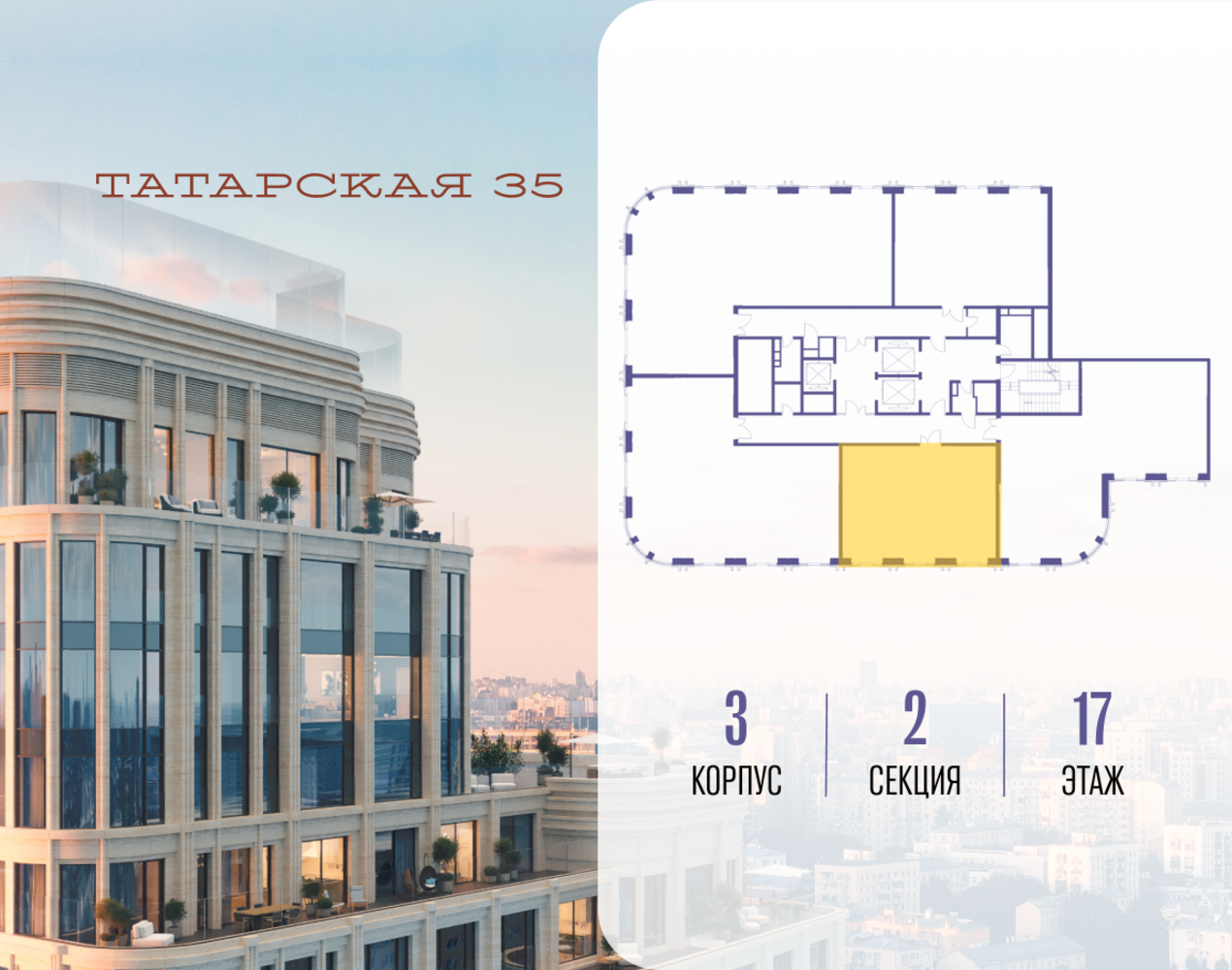 Продается просторная квартира площадью 74.40 м2 в жилом комплексе ТАТАРСКАЯ, 35. Квартира находится в 2 секции корпуса 3. Этаж 17-й из 23. Квартира без чистовой отделки, с просторной кухней 25.30 м2. Жилая площадь ― 31.00 м2. Высота потолка от 3.50. ТАТАРСКАЯ, 35 - новая архитектурная доминанта Замоскворечья, достопримечательность на фотопанорамах исторического центра Москвы. Элитный дом, созданный для тех, кто умеет смотреть далеко вперед, мыслить масштабно и воплощать собственный сценарий жизни. Вдохновляющие прогулки по променаду набережной, в уютных переулках, в парке «Зарядье», в Михайловском саду и Репинском сквере. Наслаждение высоким искусством в Третьяковской галерее, Доме Музыки, театральном музее им. А.А. Бахрушина, театре на Малой Ордынке. За окнами - Кремль, высотка на Котельнической, панорамы Замоскворечья и острова Балчуг, огни Садового кольца. Собственные спорт-румы, детская, репетиторская, бьюти-пространства, деловое пространство с коворкингом, переговорной и сигарной. Собственный трехуровневый фитнесс-центр с бассейном, тренажерным залом, сауной, хаммамом, массажным кабинетом. Площадь двора – 1,8 га, половина территории покрыта деревьями, кустарниками и лужайками. Дом расположен внутри Садового кольца – отсюда в считанные минуты можно добраться до важнейших мест столицы: достопримечательностей и парков, театров и ресторанов, деловых и административных центров. 7 минут до Кремля на автомобиле, 15 минут до Третьяковской галереи и 8 минут до Садового кольца пешком. Планировочные решения и визуализации предварительны, возможны изменения.