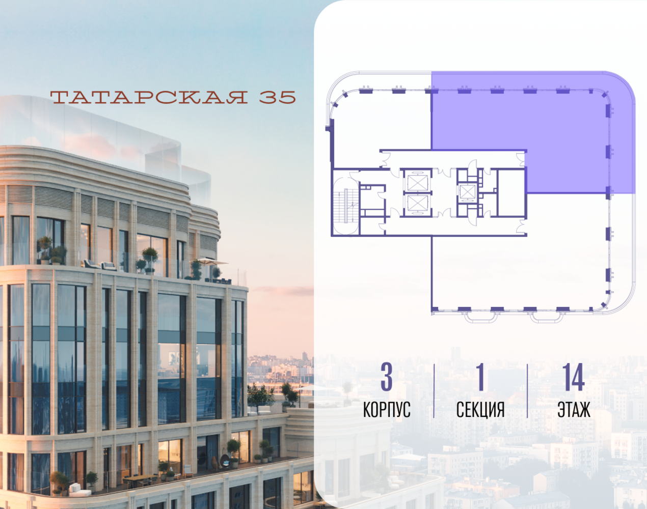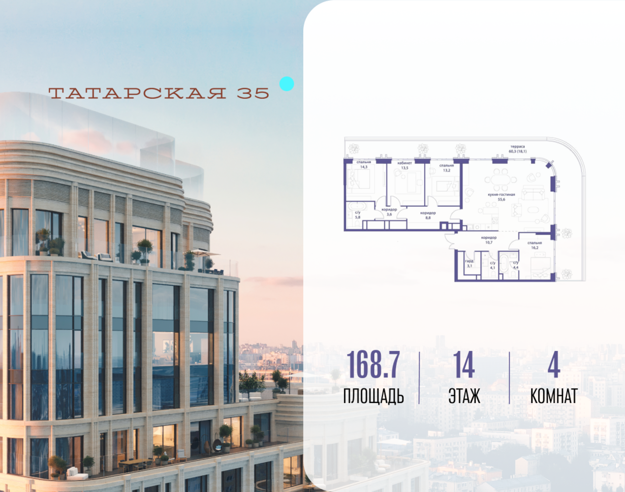 Продается просторная квартира площадью 168.70 м2 в жилом комплексе ТАТАРСКАЯ, 35. Квартира находится в 1 секции корпуса 3. Этаж 14-й из 24. Квартира без чистовой отделки, с просторной кухней 55.60 м2. Жилая площадь ― 57.20 м2. Высота потолка от 3.50. ТАТАРСКАЯ, 35 - новая архитектурная доминанта Замоскворечья, достопримечательность на фотопанорамах исторического центра Москвы. Элитный дом, созданный для тех, кто умеет смотреть далеко вперед, мыслить масштабно и воплощать собственный сценарий жизни. Вдохновляющие прогулки по променаду набережной, в уютных переулках, в парке «Зарядье», в Михайловском саду и Репинском сквере. Наслаждение высоким искусством в Третьяковской галерее, Доме Музыки, театральном музее им. А.А. Бахрушина, театре на Малой Ордынке. За окнами - Кремль, высотка на Котельнической, панорамы Замоскворечья и острова Балчуг, огни Садового кольца. Собственные спорт-румы, детская, репетиторская, бьюти-пространства, деловое пространство с коворкингом, переговорной и сигарной. Собственный трехуровневый фитнесс-центр с бассейном, тренажерным залом, сауной, хаммамом, массажным кабинетом. Площадь двора – 1,8 га, половина территории покрыта деревьями, кустарниками и лужайками. Дом расположен внутри Садового кольца – отсюда в считанные минуты можно добраться до важнейших мест столицы: достопримечательностей и парков, театров и ресторанов, деловых и административных центров. 7 минут до Кремля на автомобиле, 15 минут до Третьяковской галереи и 8 минут до Садового кольца пешком. Планировочные решения и визуализации предварительны, возможны изменения.