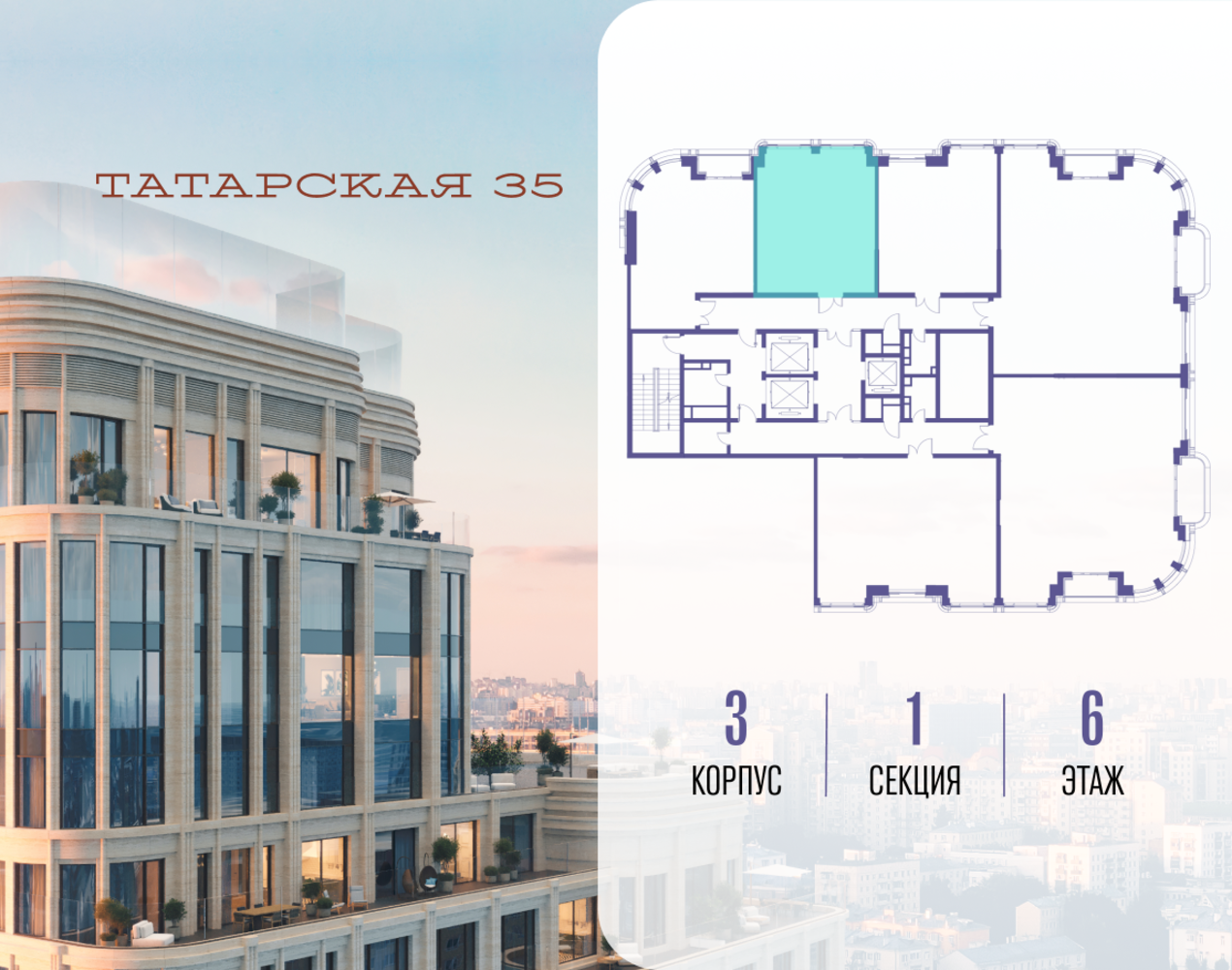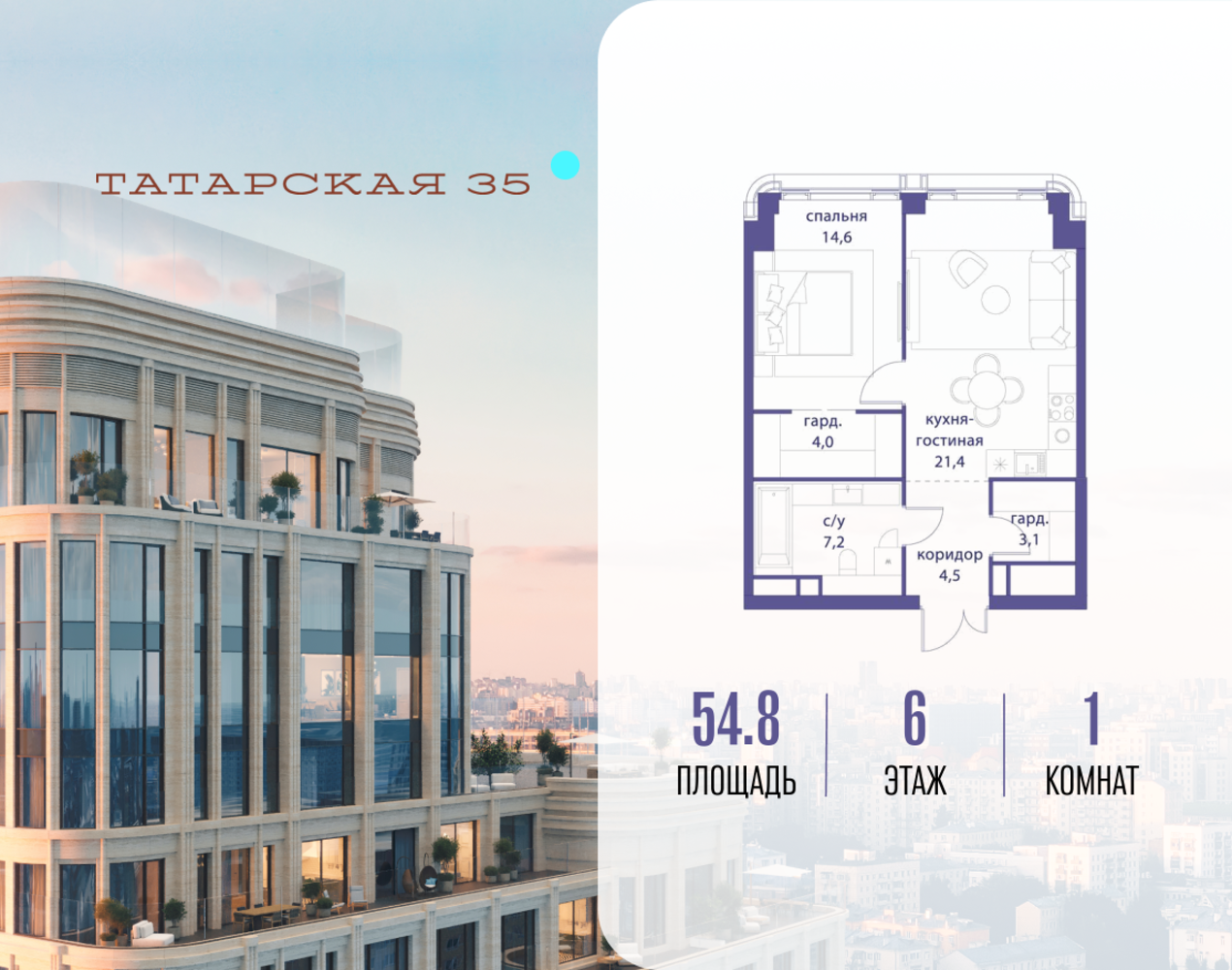 Продается просторная квартира площадью 54.80 м2 в жилом комплексе ТАТАРСКАЯ, 35. Квартира находится в 1 секции корпуса 3. Этаж 6-й из 24. Квартира без чистовой отделки, с просторной кухней 21.40 м2. Жилая площадь ― 14.60 м2. Высота потолка от 3.50. ТАТАРСКАЯ, 35 - новая архитектурная доминанта Замоскворечья, достопримечательность на фотопанорамах исторического центра Москвы. Элитный дом, созданный для тех, кто умеет смотреть далеко вперед, мыслить масштабно и воплощать собственный сценарий жизни. Вдохновляющие прогулки по променаду набережной, в уютных переулках, в парке «Зарядье», в Михайловском саду и Репинском сквере. Наслаждение высоким искусством в Третьяковской галерее, Доме Музыки, театральном музее им. А.А. Бахрушина, театре на Малой Ордынке. За окнами - Кремль, высотка на Котельнической, панорамы Замоскворечья и острова Балчуг, огни Садового кольца. Собственные спорт-румы, детская, репетиторская, бьюти-пространства, деловое пространство с коворкингом, переговорной и сигарной. Собственный трехуровневый фитнесс-центр с бассейном, тренажерным залом, сауной, хаммамом, массажным кабинетом. Площадь двора – 1,8 га, половина территории покрыта деревьями, кустарниками и лужайками. Дом расположен внутри Садового кольца – отсюда в считанные минуты можно добраться до важнейших мест столицы: достопримечательностей и парков, театров и ресторанов, деловых и административных центров. 7 минут до Кремля на автомобиле, 15 минут до Третьяковской галереи и 8 минут до Садового кольца пешком. Планировочные решения и визуализации предварительны, возможны изменения.