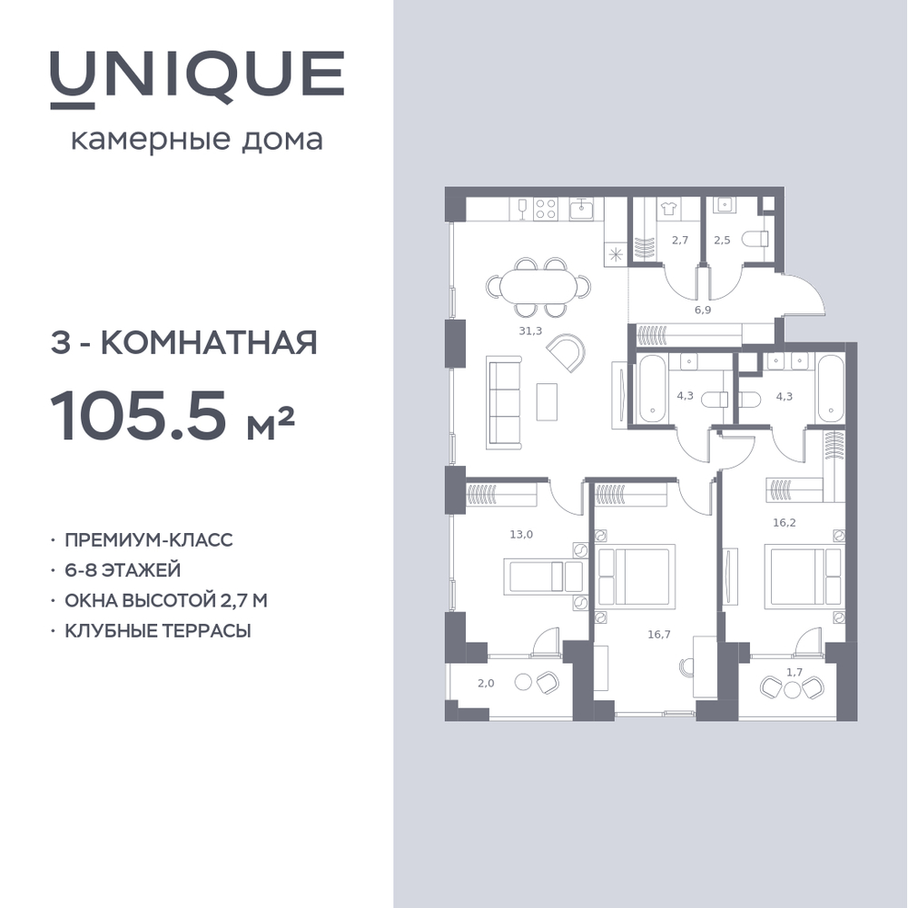 Цены указаны с условием 100% оплаты и стандартной ипотеки. Прямая продажа от застройщика! Продается 3-к. квартира квартира номер 839 общей площадью 105.5 кв.м. на 2-м этаже 8 этажного дома, корпус UNIQUE (премиум-класс). Без отделки. Проект бизнес-класса SOUL от девелопера FORMA. До метро Сокол 10 мин пешком. Архитектура от британского бюро SimpsonHaugh. Благоустройство дворов — Gillespies. Центральная площадь с фонтанами и местами для отдыха. Оборудованные детские и спортивные площадки. В центре проекта объект культурного наследия — общественное пространство Изофабрика, построенная в 30-х годах по проекту архитектора Георгия Гольца. Здесь будут располагаться мастерские для взрослых и детей, образовательный центр, рестораны и кафе. Квартиры с панорамными окнами, французскими балконами, мастер-спальнями и гардеробными. Высота потолков от 3,1 м. На последнем этаже 3,5 м. В проекте 2 детских сада на 100 и 200 малышей. Фит-рум, коворкинг, дизайнерские лобби, подземный паркинг и келлеры.