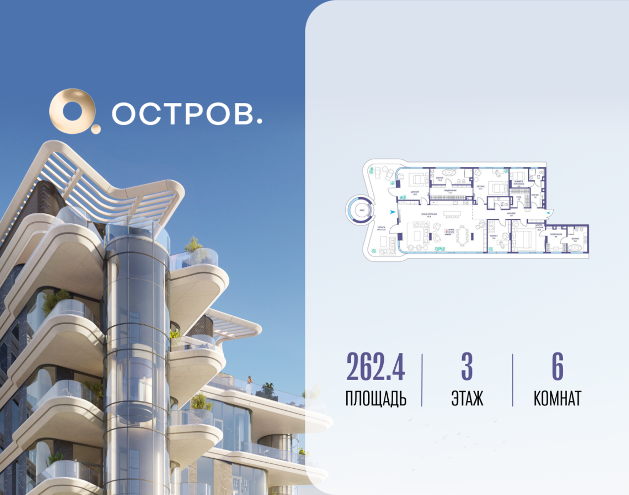 Продаётся квартира от застройщика: общая площадь 262.42 м², жилая 84.30 м², кухня 81.40 м², 3-й этаж, жилой квартал «Остров 10», (секция 1). Срок сдачи: 2 квартал 2026 года. 4 совмещенных санузла. В жилой зоне 2 больших окна на одну сторону, хорошая инсоляция. Позвоните сейчас и забронируйте квартиру! ОСТРОВ от Донстрой — жилой комплекс на западе Москвы, в Мневниковской пойме. Уникальное преимущество комплекса — в том, что он обособлен от города рекой и природным парком (650 га). Благодаря природному окружению эта территория имеет лучший экологический рейтинг в столице. Кварталы ОСТРОВА объединены ландшафтным дизайном в единое пространство — с набережными и Центральным бульваром. На ОСТРОВЕ любые объекты, необходимые для полноценной жизни и отдыха, находятся на расстоянии 15-минутной прогулки. Торговый центр и супермаркеты, кафе и рестораны, фитнес, салоны красоты, школы и детские сады. А также крупнейший в Москве спортивный кластер.