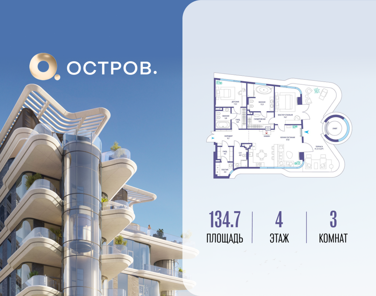 Продаётся 3-комн. квартира от застройщика: общая площадь 134.72 м², жилая 29.90 м², кухня 37.80 м², 4-й этаж, жилой квартал «Остров 10», (секция 1). Срок сдачи: 2 квартал 2026 года. 3 совмещенных санузла. В жилой зоне 2 больших окна на одну сторону, хорошая инсоляция. Позвоните сейчас и забронируйте квартиру! ОСТРОВ от Донстрой — жилой комплекс на западе Москвы, в Мневниковской пойме. Уникальное преимущество комплекса — в том, что он обособлен от города рекой и природным парком (650 га). Благодаря природному окружению эта территория имеет лучший экологический рейтинг в столице. Кварталы ОСТРОВА объединены ландшафтным дизайном в единое пространство — с набережными и Центральным бульваром. На ОСТРОВЕ любые объекты, необходимые для полноценной жизни и отдыха, находятся на расстоянии 15-минутной прогулки. Торговый центр и супермаркеты, кафе и рестораны, фитнес, салоны красоты, школы и детские сады. А также крупнейший в Москве спортивный кластер.