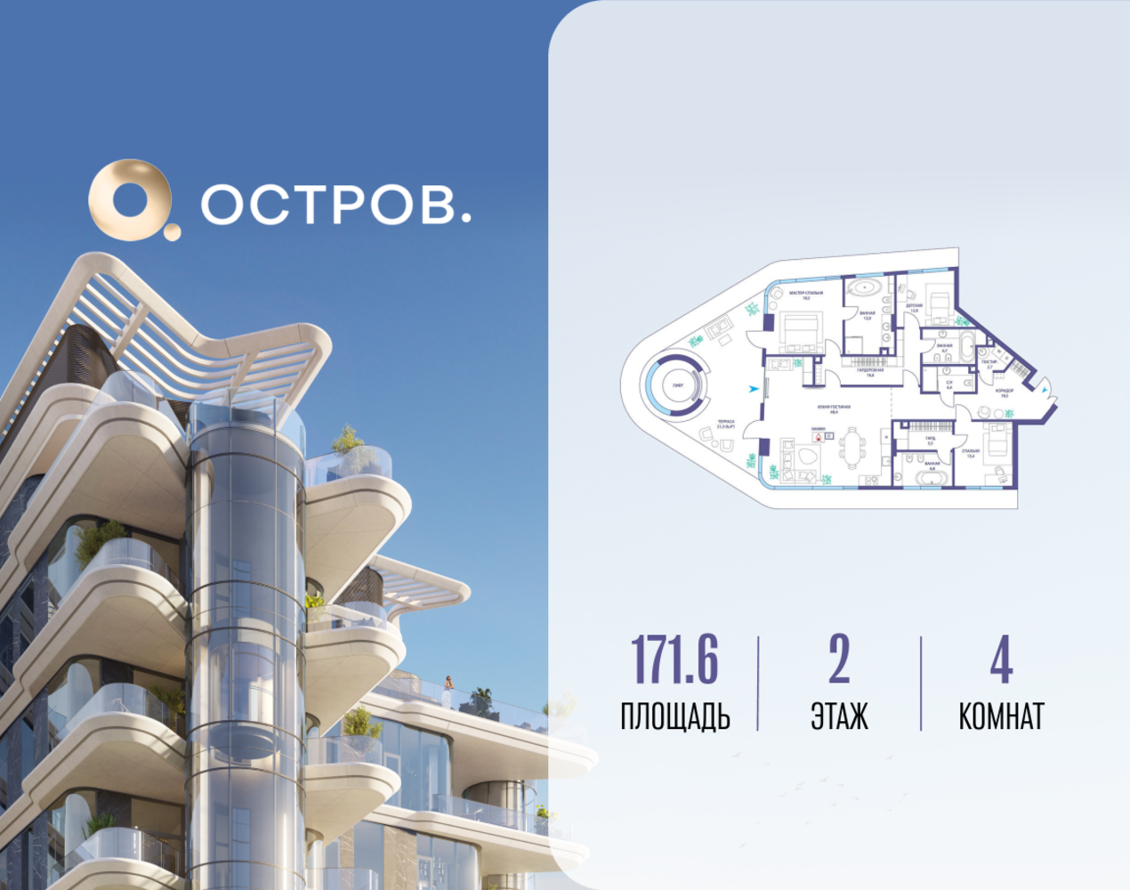 Продаётся 4-комн. квартира от застройщика: общая площадь 171.62 м², жилая 43.60 м², кухня 48.40 м², 2-й этаж, жилой квартал «Остров 10», (секция 1). Срок сдачи: 2 квартал 2026 года. 4 совмещенных санузла. В жилой зоне 2 больших окна на одну сторону, хорошая инсоляция. Позвоните сейчас и забронируйте квартиру! ОСТРОВ от Донстрой — жилой комплекс на западе Москвы, в Мневниковской пойме. Уникальное преимущество комплекса — в том, что он обособлен от города рекой и природным парком (650 га). Благодаря природному окружению эта территория имеет лучший экологический рейтинг в столице. Кварталы ОСТРОВА объединены ландшафтным дизайном в единое пространство — с набережными и Центральным бульваром. На ОСТРОВЕ любые объекты, необходимые для полноценной жизни и отдыха, находятся на расстоянии 15-минутной прогулки. Торговый центр и супермаркеты, кафе и рестораны, фитнес, салоны красоты, школы и детские сады. А также крупнейший в Москве спортивный кластер.