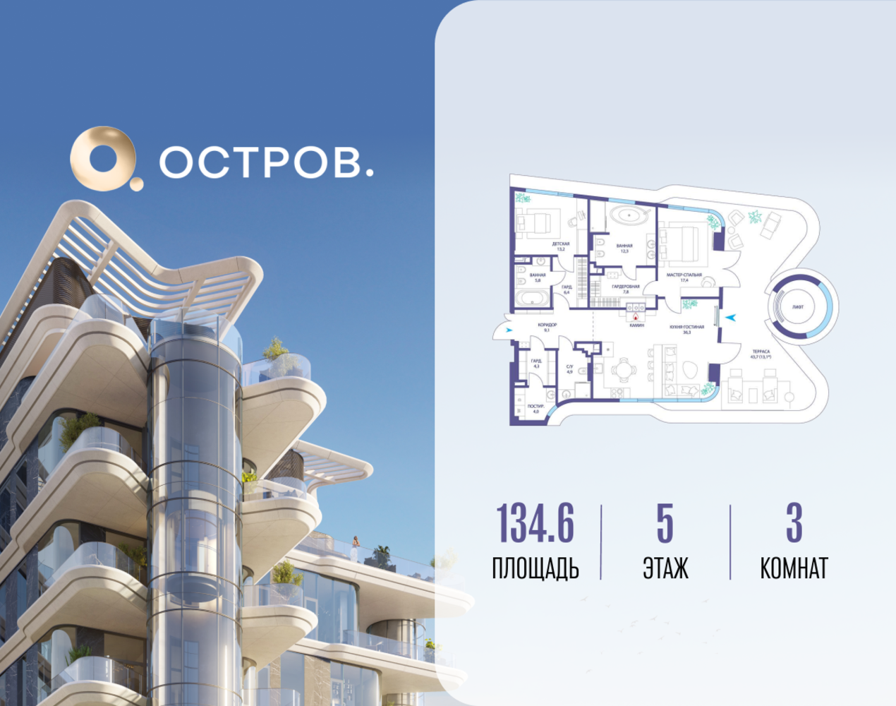 Продаётся 3-комн. квартира от застройщика: общая площадь 134.62 м², жилая 30.60 м², кухня 36.30 м², 5-й этаж, жилой квартал «Остров 10», (секция 1). Срок сдачи: 2 квартал 2026 года. 3 совмещенных санузла. В жилой зоне 2 больших окна на одну сторону, хорошая инсоляция. Позвоните сейчас и забронируйте квартиру! ОСТРОВ от Донстрой — жилой комплекс на западе Москвы, в Мневниковской пойме. Уникальное преимущество комплекса — в том, что он обособлен от города рекой и природным парком (650 га). Благодаря природному окружению эта территория имеет лучший экологический рейтинг в столице. Кварталы ОСТРОВА объединены ландшафтным дизайном в единое пространство — с набережными и Центральным бульваром. На ОСТРОВЕ любые объекты, необходимые для полноценной жизни и отдыха, находятся на расстоянии 15-минутной прогулки. Торговый центр и супермаркеты, кафе и рестораны, фитнес, салоны красоты, школы и детские сады. А также крупнейший в Москве спортивный кластер.