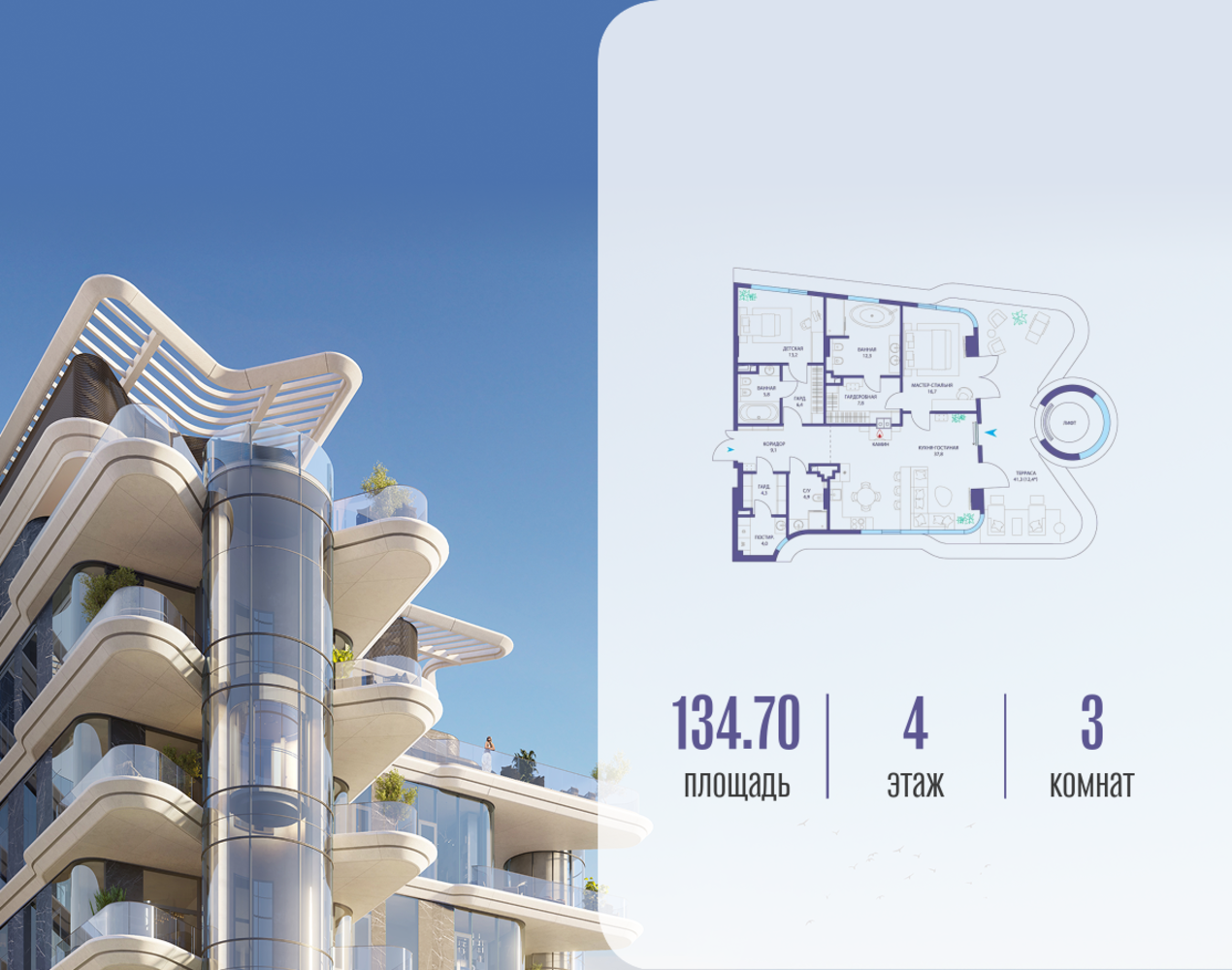 Продаётся 3-комн. квартира от застройщика: общая площадь 134.72 м², жилая 29.90 м², кухня 37.80 м², 4-й этаж, жилой квартал «Остров 10», (секция 1). Срок сдачи: 2 квартал 2026 года. 3 совмещенных санузла. В жилой зоне 2 больших окна на одну сторону, хорошая инсоляция. Позвоните сейчас и забронируйте квартиру! ОСТРОВ от Донстрой — жилой комплекс на западе Москвы, в Мневниковской пойме. Уникальное преимущество комплекса — в том, что он обособлен от города рекой и природным парком (650 га). Благодаря природному окружению эта территория имеет лучший экологический рейтинг в столице. Кварталы ОСТРОВА объединены ландшафтным дизайном в единое пространство — с набережными и Центральным бульваром. На ОСТРОВЕ любые объекты, необходимые для полноценной жизни и отдыха, находятся на расстоянии 15-минутной прогулки. Торговый центр и супермаркеты, кафе и рестораны, фитнес, салоны красоты, школы и детские сады. А также крупнейший в Москве спортивный кластер.