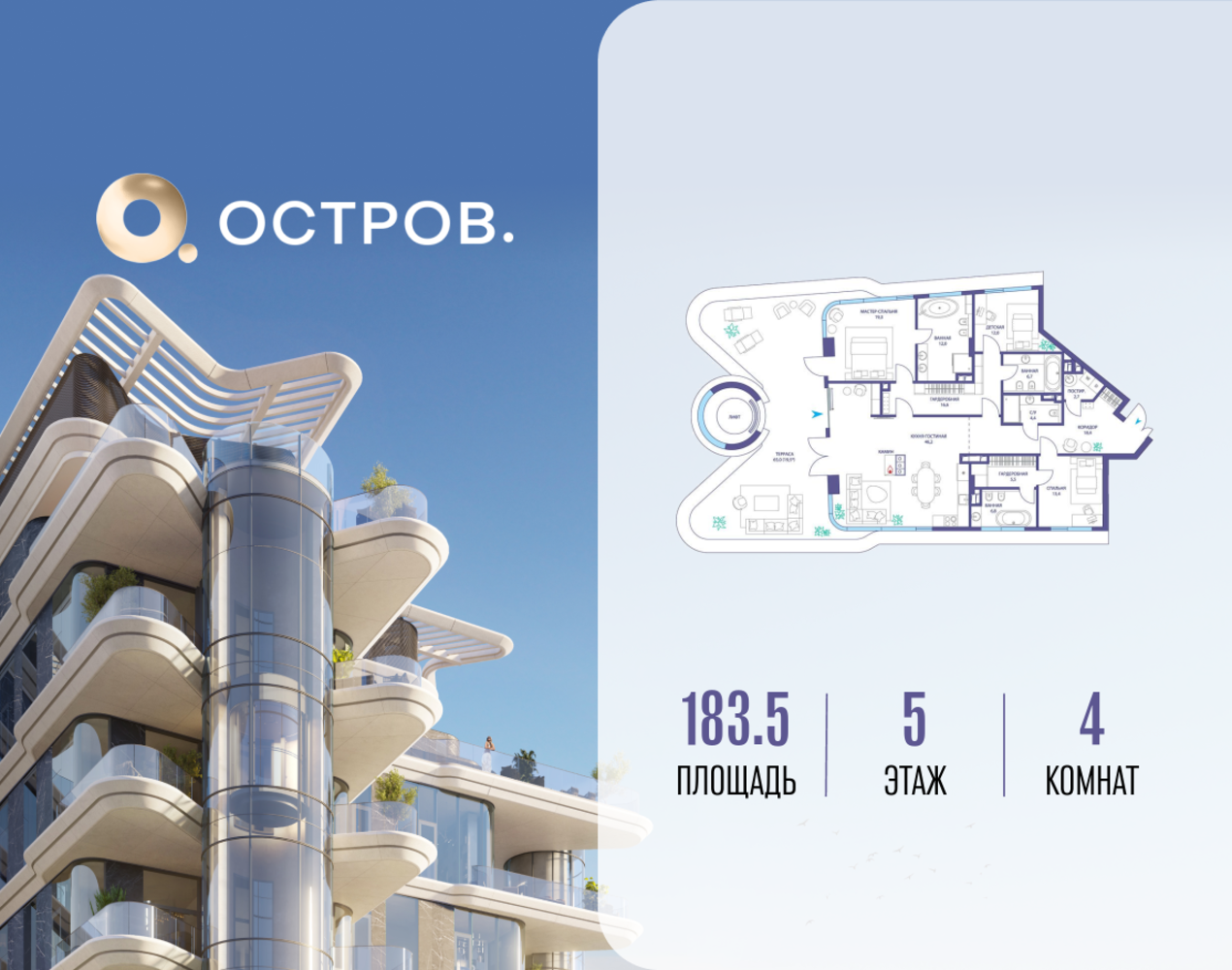 Продаётся 4-комн. квартира от застройщика: общая площадь 183.52 м², жилая 44.70 м², кухня 46.20 м², 5-й этаж, жилой квартал «Остров 10», (секция 1). Срок сдачи: 2 квартал 2026 года. 4 совмещенных санузла. В жилой зоне 2 больших окна на одну сторону, хорошая инсоляция. Позвоните сейчас и забронируйте квартиру! ОСТРОВ от Донстрой — жилой комплекс на западе Москвы, в Мневниковской пойме. Уникальное преимущество комплекса — в том, что он обособлен от города рекой и природным парком (650 га). Благодаря природному окружению эта территория имеет лучший экологический рейтинг в столице. Кварталы ОСТРОВА объединены ландшафтным дизайном в единое пространство — с набережными и Центральным бульваром. На ОСТРОВЕ любые объекты, необходимые для полноценной жизни и отдыха, находятся на расстоянии 15-минутной прогулки. Торговый центр и супермаркеты, кафе и рестораны, фитнес, салоны красоты, школы и детские сады. А также крупнейший в Москве спортивный кластер.