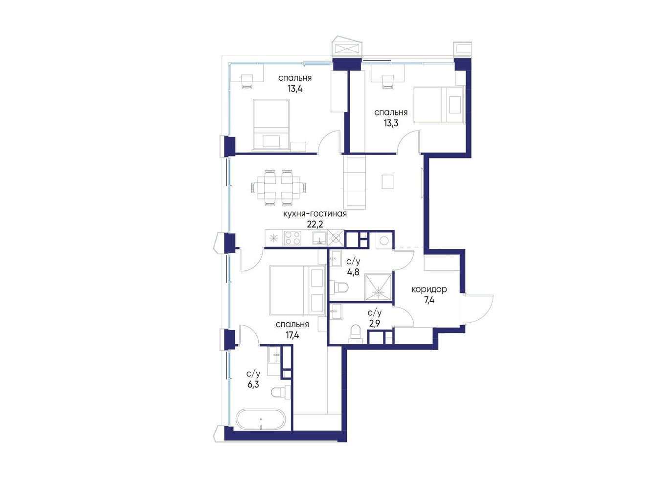 Продаётся 3-комн. квартира от застройщика: общая площадь 87.72 м², жилая 44.10 м², кухня 22.20 м², 13-й этаж, жилой квартал «Остров 14», корпус 6 (секция 1). Срок сдачи: 2 квартал 2029 года. 3 санузла (1 раздельный и 2 совмещенных). Остров.14 ДОХОДНЫЙ ДОМ – ЧАСТЬ ПРОЕКТА «ОСТРОВ», В 10 МИНУТАХ ОТ МОСКВА-СИТИ, В 15 МИНУТАХ ЕЗДЫ ОТ САДОВОГО КОЛЬЦА. Квартиры с отделкой и мебелью, и с управлением "под ключ" Постоянный доход для инвесторов, отельный сервис для арендаторов Востребованные для аренды планировки: студии, 1- и 2-комнатные квартиры 28-64 м2 Полная комплектация квартир: отделка, мебель, бытовая техника, кондиционеры Постоянный поток арендаторов – 10 минут от Москва-Сити, 5 минут от метро «Мневники», самодостаточная инфраструктура в квартале и собственная клубная инфраструктура в доме, спортивный, рекреационный и деловой кластеры на территории ОСТРОВА