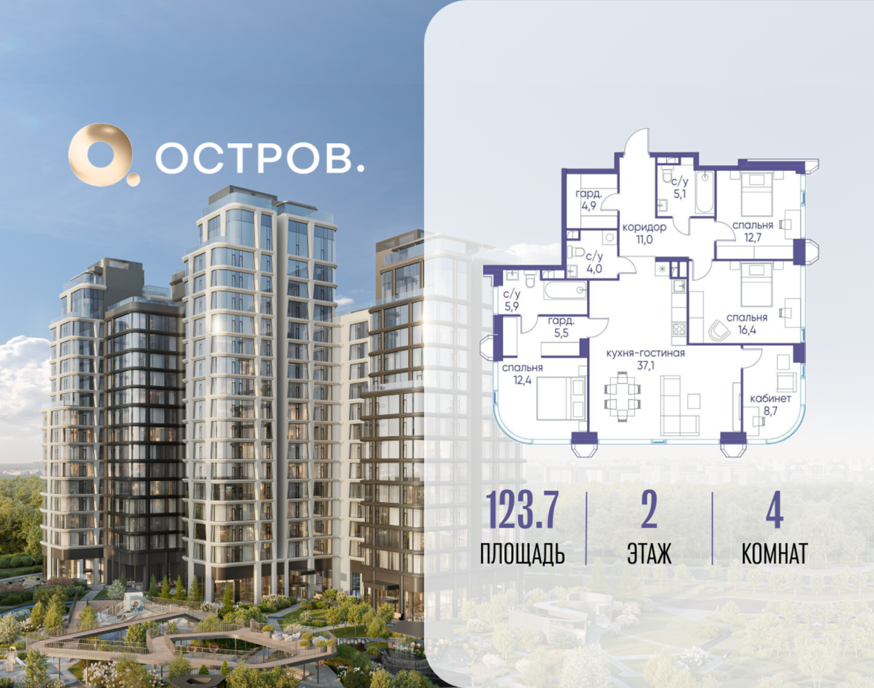 Продаётся 4-комн. квартира от застройщика: общая площадь 123.72 м², жилая 50.20 м², кухня 37.10 м², 2-й этаж, жилой квартал «Остров 12», корпус 1 (секция 2). Срок сдачи: 1 квартал 2029 года. 3 санузла (1 раздельный и 2 совмещенных). В жилой зоне 2 больших окна на одну сторону, хорошая инсоляция. Позвоните сейчас и забронируйте квартиру! ОСТРОВ от Донстрой — жилой комплекс на западе Москвы, в Мневниковской пойме. Уникальное преимущество комплекса — в том, что он обособлен от города рекой и природным парком (650 га). Благодаря природному окружению эта территория имеет лучший экологический рейтинг в столице. Кварталы ОСТРОВА объединены ландшафтным дизайном в единое пространство — с набережными и Центральным бульваром. На ОСТРОВЕ любые объекты, необходимые для полноценной жизни и отдыха, находятся на расстоянии 15-минутной прогулки. Торговый центр и супермаркеты, кафе и рестораны, фитнес, салоны красоты, школы и детские сады. А также крупнейший в Москве спортивный кластер.