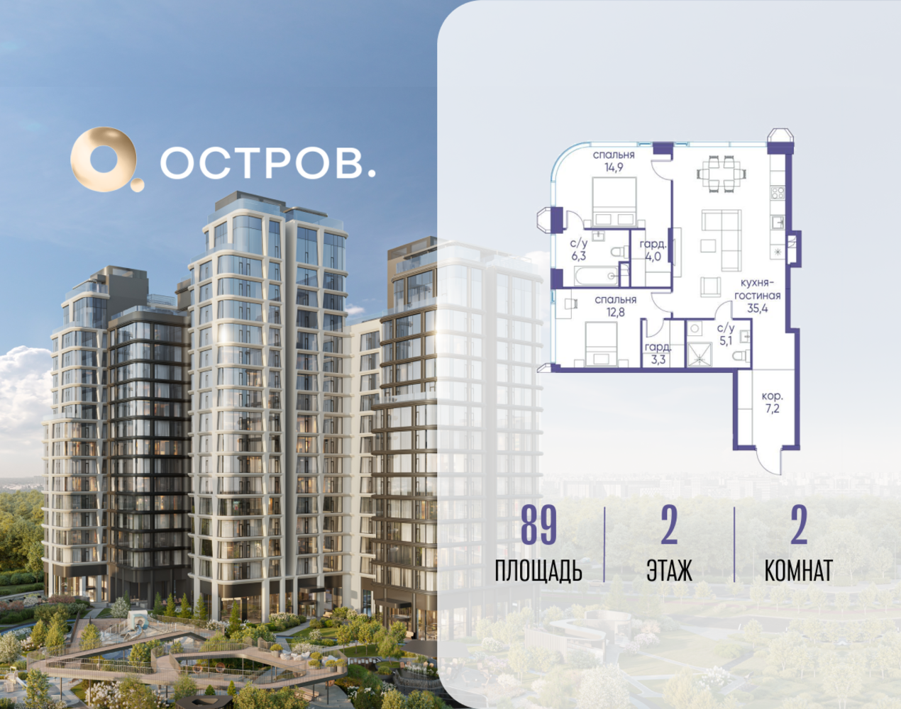 Продаётся 2-комн. квартира от застройщика: общая площадь 89.02 м², жилая 27.70 м², кухня 35.40 м², 2-й этаж, жилой квартал «Остров 12», корпус 1 (секция 2). Срок сдачи: 1 квартал 2029 года. 2 совмещенных санузла. В жилой зоне 2 больших окна на одну сторону, хорошая инсоляция. Позвоните сейчас и забронируйте квартиру! ОСТРОВ от Донстрой — жилой комплекс на западе Москвы, в Мневниковской пойме. Уникальное преимущество комплекса — в том, что он обособлен от города рекой и природным парком (650 га). Благодаря природному окружению эта территория имеет лучший экологический рейтинг в столице. Кварталы ОСТРОВА объединены ландшафтным дизайном в единое пространство — с набережными и Центральным бульваром. На ОСТРОВЕ любые объекты, необходимые для полноценной жизни и отдыха, находятся на расстоянии 15-минутной прогулки. Торговый центр и супермаркеты, кафе и рестораны, фитнес, салоны красоты, школы и детские сады. А также крупнейший в Москве спортивный кластер.